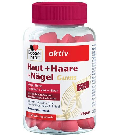 Anwendungsgebiet von Doppelherz Haut+Haare+Nägel GumsDoppelherz Haut+Haare+Nägel Gums sind ein Nahrungsergänzungsmittel mit 5 mg Zink als Beitrag für den Erhalt normaler Haut, Haare und Nägel. Schöne Haut, Haare und Nägel prägen heutzutage das Schönheitsideal unserer Gesellschaft und sind ein Zeichen für Jugend, Vitalität und Attraktivität. Die Zellen unserer Haut, Haare und Nägel erbringen durch Wachstum bzw. Erneuerung täglich Höchstleistungen. Hierfür benötigen sie Vitamine und Mineralstoffe einschließlich spezieller Spurenelemente. Zink unterstützt den Erhalt normaler Haut, Haare und Nägel. Vitamin C, Vitamin E und Selen tragen dazu bei, die Zellen vor oxidativem Stress zu schützen. Die Haut + Haare + Nägel Gums von Doppelherz haben einen leckeren Himbeergeschmack und enthalten keine Gelatine. Somit sind die Weichgummis auch für eine vegane oder vegetarische Lebensweise geeignet. Die Doppelherz aktiv Haut + Haare + Nägel Gums sind zudem ideal für alle, die eine Alternative zu Kapseln und Tabletten suchen. Wirkstoffe / Inhaltsstoffe / ZutatenZutaten von Doppelherz Haut+Haare+Nägel Gums: Glukosesirup, Zucker, modifizierte Stärke, Säureregulator, Natriumcitrate, Säuerungsmittel Äpfelsäure, Säuerungsmittel Citronensäure, L-Ascorbinsäure, Nicotinamid, DL-α-Tocopherylacetat, Zinksulfat, Pyridoxinhydrochlorid, D-Biotin, Retinylacetat, Pteroylmonoglutaminsäure, Kaliumiodid, Natriumselenit, Cyanocobalamin, natürliches Aroma, Konzentrat aus Karotte, Überzugsmittel Carnaubawachs Zusammensetzung pro Weichgummis % NRV* Vitamin A 200 µg RE 25 % Vitamin E 6 mg α-TE 50 % Vitamin C 20 mg 25 % Niacin 8 mg NE 50 % Vitamin B6 0,7 mg 50 % Folsäure 100 µg 50 % Vitamin B12 2,5 µg 100 % Biotin 500 µg 1000 % Zink 5 mg 50 % Selen 14 µg 25 % Jod 75 µg 50 % * Nährstoffbezugswerte gemäß EU-Verordnung 1169/2011 GegenanzeigenBei bekannter Überempf ...