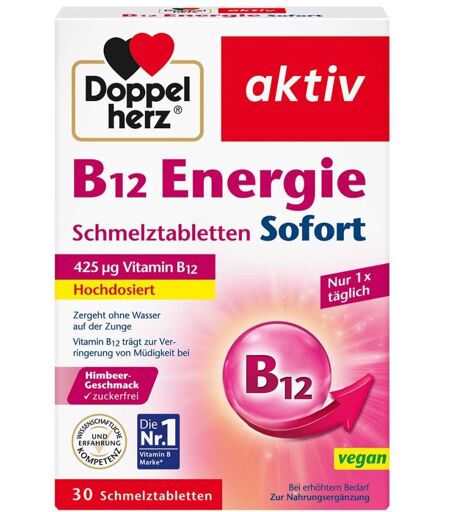 Anwendungsgebiet von Doppelherz aktiv B12 Energie Sofort SchmelztablettenDoppelherz aktiv B12 Energie Sofort Schmelztabletten sind ein Nahrungsergänzungsmittel und kann helfen bei einem erhöhten Bedarf oder einer unausgewogenen Ernährung, den Vitamin B12 Bedarf zu decken. Für Gesundheit, Energie und Leistungsfähigkeit spielt eine ausreichende Versorgung mit Nährstoffen eine wichtige Rolle. Eine höhere Zufuhr von Vitamin B12 kann einen Beitrag zur Versorgung leisten. So unterstützt das Vitamin B12 bei erhöhtem Bedarf, bei einer unausgewogenen Ernährung oder bei nachlassender Vitamin B12-Verwertung im fortschreitenden Alter. Eine Schmelztablette Doppelherz B12 Energie enthält 425 µg Vitamin B12 und unterstützt daher die gute Vitamin B12-Versorgung. Vitamin B12 trägt zu einem normalen Energiestoffwechsel, zur Verringerung von Müdigkeit und Erschöpfung sowie zu einer normalen Funktion des Nervensystems bei. Wirkungsweise von Doppelherz aktiv B12 Energie Sofort Schmelztabletten Wirkstoffe / Inhaltsstoffe / ZutatenZutaten von Doppelherz aktiv B12 Energie Sofort Schmelztabletten: Füllstoff Mannit, Füllstoff Isomalt, Stärke, Trennmittel vernetzte Carboxymethylcellulose, Säurungsmittel Citronensäure, Aroma, Trennmittel Magnesiumsalze der Speisefettsäuren, Vitamin B12 Zusammensetzung pro Tagesportion (= 1 Tablette) % NRV* Vitamin B12 425 μg 17000 % * Nährstoffbezugswerte gemäß EU-Verordnung 1169/2011GegenanzeigenBei bekannter Überempfindlichkeit gegenüber einen der oben genannten Inhaltsstoffe sollte dieses Produkt nicht angewendet werden.DosierungVerzehrempfehlung von Doppelherz aktiv B12 Energie Sofort Schmelztabletten: Einmal täglich eine Tablette unter oder auf die Zunge legen und langsam schmelzen lassen. EinnahmeDie Schmelztabletten mit leckerem Himbeer-Geschmack werden direkt unter oder auf die Zunge gegeben und lösen sich dort auf.HinweiseNahrungsergänzungsmittel stellen kein ...