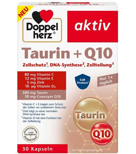 Anwendungsgebiet von Doppelherz Taurin + Q10 KapselnDoppelherz Taurin + Q10 Kapseln enthält 300 mg Taurin und 30 mg Coenzym Q10. Ergänzt wird die Rezeptur durch Vitamin C und E zum Schutz der Zellen, Vitamin D für die DNA-Synthese und Zink für die Zellteilung. Im hektischen Alltag wird uns körperlich und geistig häufig viel abverlangt. Jeden Tag sind unsere Zellen unzähligen Herausforderungen ausgesetzt – dazu zählt auch oxidativer Stress, der beispielsweise durch Umweltfaktoren entstehen kann. Vitamin C und E leisten einen Beitrag zum Schutz der Zellen vor oxidativem Stress, während Vitamin D eine Funktion bei der Zellteilung hat und Zink zu einer normalen kognitiven Funktion beiträgt. Taurin ist eine organische Verbindung, die in verschiedenen Geweben des Körpers vorhanden ist. Es findet sich in höherer Konzentration in Muskeln, Gehirn, Herz und Augen. Taurin ist außerdem in Lebensmitteln wie Fisch, Fleisch und Meeresfrüchten enthalten und kann für verschiedene Anwendungen synthetisch hergestellt werden. Coenzym Q10 ist ein Bestandteil der Ubichinone und kommt in vielen Bereichen des Körpers vor, insbesondere in Organen wie dem Herz, den Nieren, der Leber und der Muskulatur. Es wird in den Mitochondrien der Zellen gespeichert und kann sowohl vom Körper produziert als auch über die Nahrung aufgenommen werden. Vitamin C und E tragen zum Schutz der Zellen vor oxidativem Stress bei. Zink leistet einen Beitrag zu einer normalen DNA-Synthese. Vitamin D hat eine Funktion bei der Zellteilung. Vitamin D trägt zu einer normalen Funktion des Immunsystems und der Muskeln bei und leistet einen Beitrag zum Erhalt normaler Knochen. Magnesium leistet einen Beitrag zu einer normalen Muskelfunktion und einen normalen Energiestoffwechsel. Vitamin B12 trägt zur Verringerung von Müdigkeit und zu einem normalen Energiestoffwechsel bei.Wirkstoffe / Inhaltsstoffe / ZutatenZutaten von Doppelherz Taurin + Q10 Kapseln:Taurin, Magnesiumoxid, Gelatine (Rind), Vitamin ...