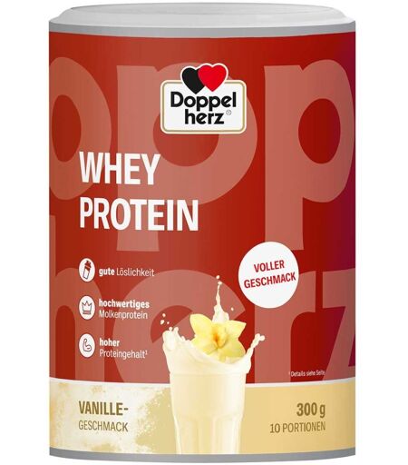 Anwendungsgebiet von Doppelherz Whey Protein Vanille-Geschmack PulverDoppelherz Whey Protein Vanille-Geschmack Pulver kombiniert hochwertiges Molkenproteinkonzentrat (Whey Protein) mit einem angenehm milden Vanille-Geschmack – für alle, die ihre Ernährung bewusst gestalten möchten. Das feine Proteinpulver eignet sich besonders für sportlich aktive Menschen, die Wert auf eine eiweißreiche Ernährung legen, sei es im Rahmen von Krafttraining, Ausdauertraining oder im aktiven Alltag. Molkenprotein zählt zu den besonders gut verwertbaren Eiweißquellen und liefert dem Körper essentielle Eiweißbausteine. Proteine tragen zu einer Zunahme an Muskelmasse und zur Erhaltung von Muskelmasse sowie zum Erhalt normaler Knochen bei. Besonders bei sportlicher Aktivität oder bei erhöhtem Eiweißbedarf – etwa im Rahmen von Muskelaufbau-Phasen – kann eine gezielte Ergänzung der Ernährung mit Protein sinnvoll sein. Die praktische Zubereitung mit Wasser oder fettarmer Milch ermöglicht eine flexible Integration in jede Lebensweise: Ob als schneller Shake nach dem Training, zum Frühstück oder als ergänzende Eiweißquelle zwischendurch – Doppelherz WHEY PROTEIN Vanille passt in jeden Tagesablauf. Die cremige Konsistenz und der Vanille-Geschmack sorgen für einen angenehmen und vollen Genuss.Wirkstoffe / Inhaltsstoffe / ZutatenZutaten von Doppelherz Whey Protein Vanille-Geschmack Pulver:Molkenproteinkonzentrat (98 %), Aromen, Emulgator Lecithine, Trennmittel Siliciumdioxid, Süßungsmittel SucraloseGegenanzeigenBei bekannter Überempfindlichkeit gegenüber einen der oben genannten Inhaltsstoffe sollte dieses Produkt nicht angewendet werden.DosierungVerzehrempfehlung von Doppelherz Whey Protein Vanille-Geschmack Pulver:200 ml Wasser oder 200 ml fettarme Milch (1,5 % Fett) in einen Shaker geben, dann 30 g Pulver (2 gehäufte Messlöffel) dazu geben, gut schütteln und trinken.Empfohlen werden 1 – 2 Portionen pro Tag. Nach dem Training oder morgens verzehren.Doppel ...