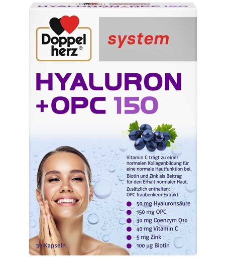Anwendungsgebiet von Doppelherz Hyaluron+opc System KapselnDoppelherz Hyaluron+opc System Kapseln sind ein Nahrungsergänzungsmittel und enthalten 50 mg Hyaluronsäure + 150 mg OPC in Kombination mit 30 mg Coenzym Q10, Biotin und Vitamin C sowie dem Spurenelement Zink.Wirkstoffe / Inhaltsstoffe / ZutatenZutaten von Doppelherz Hyaluron+opc System Kapseln: Hyaluronhaltiges Kollagenhydrolysat, OPC-haltiger Traubenkernextrakt, Gelatine (Rind), Vitamin C, Coenzym Q10, Trennmittel Magnesiumsalze der Speisefettsäuren, Zinkcarbonat, Trennmittel Siliciumdioxid, Farbstoff Eisenoxide und Eisenhydroxide, BiotinGegenanzeigenBei bekannter Überempfindlichkeit gegenüber einen der oben genannten Inhaltsstoffe sollte dieses Produkt nicht angewendet werden.DosierungVerzehrempfehlung von Doppelherz Hyaluron+opc System Kapseln: Täglich 1 Kapsel mit ausreichend Flüssigkeit unzerkaut einnehmen.HinweiseNahrungsergänzungsmittel stellen keinen Ersatz für eine abwechslungsreiche Ernährung dar. Eine ausgewogene Ernährung und gesunde Lebensweise sind wichtig. Die empfohlene tägliche Verzehrmenge sollte nicht überschritten werden. Außerhalb der Reichweite von kleinen Kindern aufbewahren. Kühl und trocken lagern. Doppelherz Hyaluron+opc System Kapseln können in Ihrer Versandapotheke www.juvalis.de erworben werden. ...