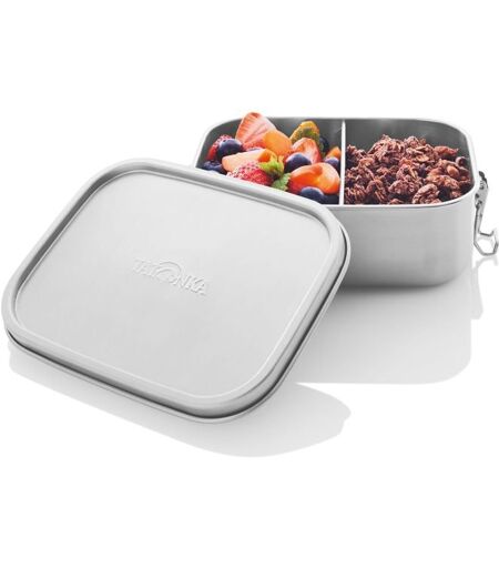 Die Tatonka Lunchbox II Lock bietet mit der innenliegenden Trennwand aus Edelstahl die Möglichkeit, verschiedene Lebensmittel in einer Box getrennt voneinander zu transportieren, sodass zum Beispiel das Brot nicht vom Salatdressing komplett aufgeweicht wird. Der Deckel der Tatonka Lunchbox II Lock hat eine Silikondichtung bekommen, sodass die meisten deiner Mahlzeiten auslaufsicher ans Ziel kommen. Lediglich Suppe oder andere Flüssigkeiten solltest du hierin nicht transportieren. Die beiden seitlichen Klemmen halten den abgedichteten Deckel dabei fest auf der Dose. Die Tatonka Lunchbox II Lock gibt es in 800 ml und 1000 ml Größe, wobei die kleinere Dose mittig unterteilt ist und die größere Box ein kleines und ein größeres Abteil besitzt. Auch hier profitierst du von dem pflegeleichten, unempfindlichen und spülmaschinenfesten Edelstahlmaterial, das auch säurehaltige und salzhaltige Lebensmittel problemlos verträgt. Falls du übrigens keine innere Aufteilung haben möchtest, findest du bei uns im Shop auch die Lunchbox I des Herstellers, die keine Trennwand besitzt. ...