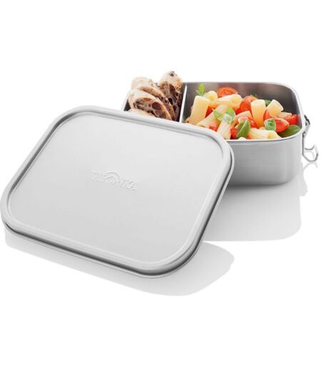 Die Tatonka Lunchbox II Lock bietet mit der innenliegenden Trennwand aus Edelstahl die Möglichkeit, verschiedene Lebensmittel in einer Box getrennt voneinander zu transportieren, sodass zum Beispiel das Brot nicht vom Salatdressing komplett aufgeweicht wird. Der Deckel der Tatonka Lunchbox II Lock hat eine Silikondichtung bekommen, sodass die meisten deiner Mahlzeiten auslaufsicher ans Ziel kommen. Lediglich Suppe oder andere Flüssigkeiten solltest du hierin nicht transportieren. Die beiden seitlichen Klemmen halten den abgedichteten Deckel dabei fest auf der Dose. Die Tatonka Lunchbox II Lock gibt es in 800 ml und 1000 ml Größe, wobei die kleinere Dose mittig unterteilt ist und die größere Box ein kleines und ein größeres Abteil besitzt. Auch hier profitierst du von dem pflegeleichten, unempfindlichen und spülmaschinenfesten Edelstahlmaterial, das auch säurehaltige und salzhaltige Lebensmittel problemlos verträgt. Falls du übrigens keine innere Aufteilung haben möchtest, findest du bei uns im Shop auch die Lunchbox I des Herstellers, die keine Trennwand besitzt. ...