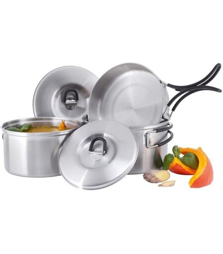 Das Tatonka Cookset Regular ist – abgesehen von der Ummantelung der Griffe – komplett aus Edelstahl gefertigt. Dadurch ist es extrem robust, pflegeleicht und geschmacksneutral und stört sich im Unterschied zu unbehandeltem Aluminium auch nicht an der Zubereitung von salz- oder säurehaltigen Lebensmitteln. In den Töpfen ist jeweils eine Skalierung auf der Innenseite angebracht, sodass du zum Beispiel für Fertigmahlzeiten die Wassermengen abmessen kannst. Durch das großzügige Füllvolumen bietet sich das Kochset jedoch gerade dafür an, statt Fertigmahlzeiten auch einmal aufwändigere Gerichte zu kochen. Mit den ummantelten Klappgriffen lassen sich die Töpfe und die Pfanne bequem von der Kochstelle nehmen und die beiden Deckel sorgen dafür, dass die Kochzeit reduziert und die Wärme länger zurückgehalten wird. Auch die Deckel haben dabei einen kleinen Griff erhalten. Nach ihrem Einsatz lassen sich die Töpfe ineinander stapeln und auf die Pfanne stellen, sodass alles kompakt in den mitgelieferten Packsack passt. Im kleinen Topf bleibt dabei auch noch ein wenig Platz, um zum Beispiel den Kocher, eine kleine Gaskartusche oder Lebensmittel zu transportieren. Alles in allem ist das Tatonka Cookset Regular ein hochwertig verarbeitetes Kochset für zwei Personen, mit du unterwegs sowohl für die schnelle Küche als auch für umfangreiche Outdoor Menüs bestens gerüstet bist. ...