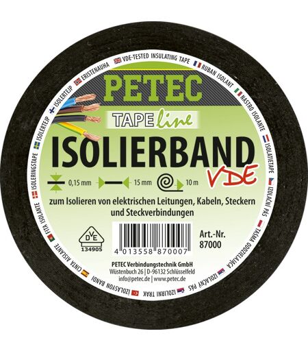 PETEC Isolierband (15mm x 10m) Mengeneinheit: Meter einseitig/doppelseitig: einseitig Länge: 10: m Montageinformation beachten Gebindeart: Rolle Temperaturbereich bis: 90: °C Breite 1: 15 mm Farbe: schwarz Technische Daten beachten Dicke/Stärke 1: 0,15 mm Zum Isolieren von elektrischen Leitungen, Kabeln, Steckern und Steckverbindungen. Eigenschaften: VDE-geprüft hohe Klebekraft witterungs- und alterungsbeständig hervorragende Dehnungs- und Entspannungseigenschaften für Innen- und Außenanwendungen ...
