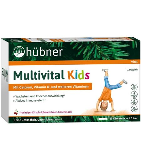 Anwendungsgebiet von Hübner Multivital Kids FlüssigFÜR GESUNDES WACHSTUM:Kinder wollen groß und stark werden – dafür braucht der Körper viele wichtige Mikronährstoffe. Multivital Kids liefert 14 essenzielle Nährstoffe für gesunde Entwicklung und starke Knochen.CALCIUM & VITAMIN D:Diese beiden Nährstoffe unterstützen das Wachstum und die normale Knochenentwicklung. Vitamin D trägt zudem zu einer normalen Funktion des Immunsystems bei Kindern bei.AUCH FÜR ERWACHSENE GEEIGNET:Neben Kindern profitieren auch Erwachsene von der ausgewogenen Nährstoffzusammensetzung – ideal als tägliche Ergänzung.FRUCHTIGER GENUSS:Die praktischen Sticks schmecken angenehm nach Kirsche und Johannisbeere. Sie sind direkt verzehrbar oder können in Joghurt oder Saft einrührt werden.Wirkstoffe / Inhaltsstoffe / ZutatenZutaten von Hübner Multivital Kids Flüssig:Kirschsaft aus Kirschsaftkonzentrat (42 %), Rohrohrzucker, Johannisbeersaft aus Johannisbeersaftkonzentrat (17 %), Wasser, Calciumsalze der Zitronensäure, Vitamin C, Vitamin E, Vitamin D3, Vitamin A, Niacin, Vitamin B1, Vitamin B2, Biotin, Vitamin B6, Vitamin B12, Verdickungsmittel: Guarkernmehl, Johannisbrotkernmehl, Pektin natürliche Aromen.GegenanzeigenBei bekannter Überempfindlichkeit gegenüber einen der oben genannten Inhaltsstoffe sollte dieses Produkt nicht angewendet werden.DosierungVerzehrempfehlung von Hübner Multivital Kids Flüssig:Erwachsene und Kinder ab 4 Jahren: 1 Direktstick (15 ml) am Tag. Zur direkten Einnahme. Stick durchkneten.HinweiseNahrungsergänzungsmittel stellen keinen Ersatz für eine abwechslungsreiche Ernährung dar. Eine ausgewogene Ernährung und gesunde Lebensweise sind wichtig. Die empfohlene tägliche Verzehrmenge sollte nicht überschritten werden. Außerhalb der Reichweite von kleinen Kindern aufbewahren. Kühl und trocken lagern.Hübner Multivital Kids Flüssig können in Ihrer Versandapotheke www.apolux.de erworben werden. ...
