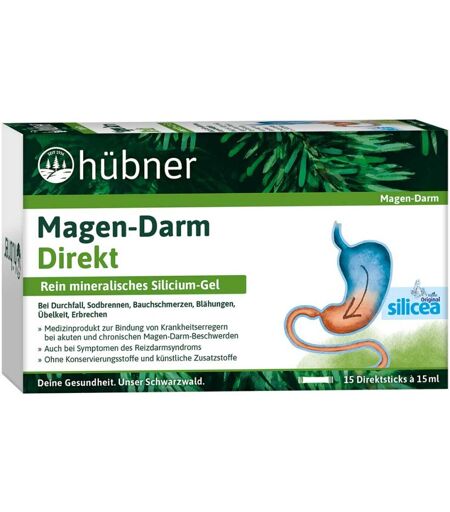 Anwendungsgebiet von Hübner Magen-Darm Direkt GelBESONDERE EIGENSCHAFTEN:Dank der außergewöhnlich hohen Bindungfähigkeit für krankmachende Erreger, deren Giftstoffe und Gase, kann das Kieselsäure-Gel bei Verdauungsbeschwerden effektiv helfen und auch bei lästigen Blähungen wohltuend wirken.NATÜRLICHE REINIGUNG:Die in Magen und Darm auf physikalische Weise gebundenen Schadstoffe werden über den Darm auf natürlichem Weg ausgeschieden – ganz ohne chemische Wirkstoffe.EINFACHE ANWENDUNG UNTERWEGS:Die Direktsticks können direkt und ohne Wasser verwendet werden und müssen nicht gekühlt werden – perfekt für Ausflüge, Reisen oder für’s Büro.Wirkstoffe / Inhaltsstoffe / ZutatenHübner Magen-Darm Direkt Gel enthält:Wirksamer Bestandteil: 100 ml Gel enthalten 100 ml Kieselsäure-Gel mit 3,5 g SiliciumdioxidGegenanzeigenBei bekannter Überempfindlichkeit gegenüber einen der oben genannten Inhaltsstoffe sollte dieses Produkt nicht angewendet werden.DosierungAnwendungsempfehlung von Hübner Magen-Darm Direkt Gel:Bei akuten Beschwerden nehmen Kinder und Erwachsene 3- bis 5-mal täglich 2 Direktsticks à 15 ml direkt ein. Der Stick kann auch in Wasser oder Tee eingerührt werden. Die Einnahme sollte zwischen den Mahlzeiten und ggf. direkt vor dem Schlafengehen erfolgen.Die Anwendung kann nach Abklingen der akuten Beschwerden mit einer Dosierung von 3-mal täglich 1 Direktstick à 15 ml noch einige Tage fortgesetzt werden. Bei chronischen Beschwerden nehmen Erwachsene 3-mal täglich 1 Direktstick à 15 ml direkt in Wasser oder Tee nüchtern oder zwischen den Mahlzeiten ein. Bei chronischen Beschwerden empfehlen wir eine Behandlung von bis zu 6 Wochen, wobei sich eine Besserung der Symptome bereits nach einer 3-wöchigen Behandlung zeigen kann