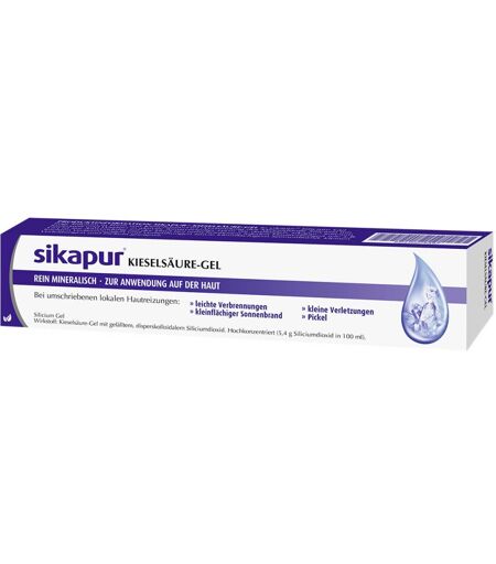 Anwendungsgebiet von Sikapur GelSikapur Gel wird zum Auftragen Bei lokalen Hautreizungen wie leichten Verbrennungen und Verbrühungen, kleinflächigem Sonnenbrand, kleinen Verletzungen (z. B. Rasurbrand) und Pickeln angewendet. Wirkungsweise von Sikapur GelDas Silicium in Form von Kieselsäure in in Sikapur Gel wirkt kühlend und austrocknend sowie entzündungshemmend.Wirkstoffe / Inhaltsstoffe / ZutatenInhaltsstoffe von Sikapur Gel: