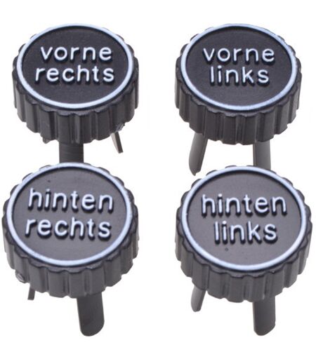 FILMER Reifenmarkierer 4teilig Eigenschaften: Reifenmarkierer 4teilig zum Markieren der Winter- oder Sommerreifen bei der Einlagerung jeweils 1 Stück mit der Aufschrift vorne rechts, vorne links, hinten rechts und hinten links in Felgenloch/Radmutternloch stecken Farbe: schwarz mit weißer Schrift Maße: Ø 26 x 31 mm Material: ABS Verpackung: Blisterkarte ...