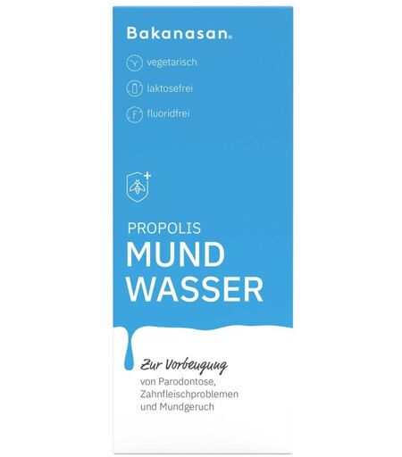 Anwendungsgebiet von Bakanasan Propolis MundwasserBakanasan Propolis Mundwasser ist ein erfrischendes Mundwasser-Konzentrat zur Bekämpfung und Hemmung von Bakterien, sowie zur Vorbeugung von Parodontose, Zahnfleischproblemen und Mundgeruch. Dank der langanhaltenden Wirkung verbleibt ein nachhaltig frischer Atem. Wirkungsweise von Bakanasan Propolis MundwasserBakanasan Propolis Mundwasser verfügt über Propolis, dem hochwertigen Schutzharz der Bienen, das speziell für die Mund- und Zahnpflege bedeutende keimhemmende und entzündungsvorbeugende Eigenschaften aufweist. Zusätzlich beinhaltet Bakanasan Propolis Mundwasser Salbei und Kamille aus kontrolliert biologischem Anbau, die die wohltuende Wirkung unterstützen. Tipp: Für eine tägliche effektive Hygiene von Mund und Zähnen empfiehlt sich die Kombination mit der Bakansan Propolis Zahncreme.Wirkstoffe / Inhaltsstoffe / ZutatenBakanasan Propolis Mundwasser enthält: Aqua (Water), Alcohol, Glycerin, Caprylyl/ Capryl Glucoside, Xylitol, Polyglyceryl-10 Laurate, Aroma (Fragrance), Mentha Piperita Oil (Peppermint), Babassu Oil Polyglyceryl-4 Esters, Propolis Extract, Citric Acid, Limonene, Salvia Officinalis Oil (Sage), Sodium Hydroxide, Ascorbic Acid, Chamomilla Recutita Flower Extract (Matricaria)*, Salvia Officinalis Leaf Extract (Sage)*. * aus kontrolliert biologischem Anbau Propolisgehalt 1,7 g/ 100 mlGegenanzeigenBei bekannter Überempfindlichkeit gegenüber einen der oben genannten Inhaltsstoffe sollte das Produkt nicht angewendet werden.DosierungAnwendungsempfehlung von Bakanasan Propolis Mundwasser: Für die ideale tägliche Mundhygiene geben Sie zweimal täglich 2-3 Tropfen auf ein halbes Glas Wasser. Kräftig spülen und anschließend ausspucken. Tipp: Für eine tägliche effektive Hygiene von Mund und Zähnen empfiehlt sich die Kombination mit der Bakansan Propolis Zahncreme. Bakanasan Propolis Mundwasser können in Ihrer Versandapotheke www.juvalis.de erworben werden. ...
