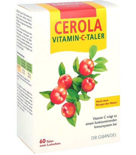 Wirkstoffe / Inhaltsstoffe / ZutatenZutaten von Cerola Vitamin C Taler Grandel: Acerola-Zubereitung (78,3 % hergestellt aus Acerola-Fruchtsaft, Rohrzucker, Traubenzucker, Vitamin C, Maniokstärke), Rohrzucker, Vitamin C, Trennmittel Magnesiumsalze der Speisefettsäuren, Himbeerpulver, natürliche Aromen, flavonoidreicher Citrusfrüchte-Extrakt, Hagebuttenpulver, schwarzes Johannisbeerpulver, grüner Pfeffer.GegenanzeigenBei bekannter Überempfindlichkeit gegenüber einem der oben genannten Inhaltsstoffe sollte dieses Produkt nicht angewendet werden. DosierungTäglich einen halben Cerola Vitamin C Taler Grandel lutschen. In Zeiten erhöhten Vitamin-C-Bedarfs empfiehlt sich die Einnahme eines ganzen Talers. HinweiseDie angegebene empfohlene tägliche Verzehrsmenge darf nicht überschritten werden. Nahrungsergänzungsmittel sollten nicht als Ersatz für eine ausgewogene und abwechslungsreiche Ernährung dienen. Achten Sie auf eine gesunde Lebensweise. Außerhalb der Reichweite von kleinen Kindern aufbewahren. Cerola Vitamin C Taler Grandel können in Ihrer Versandapotheke www.juvalis.de erworben werden. ...