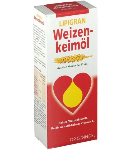 Nahrungsergänzungsmittel sind kein Ersatz für eine ausgewogene und abwechslungsreiche Ernährung und eine gesunde Lebensweise. LIPIGRAN WeizenkeimölReines Weizenkeimöl. Reich an natürlichem Vitamin E.Zutaten: Weizenkeimöl Zusammensetzung:Zusammensetzungpro 15 ml (= 13,8 g)% der Referenzmenge*einfach ungesättigte Fettsäuren2,5 g-**mehrfach ungesättigte Fettsäuren9,0 g-**Vitamin E (D-alpha-Tocopherol-Äquivalente)28 mg233 %*Referenzmenge für die tägliche Zufuhr gemäß EU-Lebensmittelinformationsverordnung.** Keine Referenzmenge definiert.Verzehrsempfehlung:Täglich insgesamt 15 ml (= 13,8 g) LIPIGRAN Weizenkeimöl zu oder nach den Hauptmahlzeiten entweder pur verwenden oder geeigneten Speisen zusetzen, jedoch nicht mitkochen.Hinweis:Die angegebene empfohlene Tagesmenge darf nicht überschritten werden.Aufbewahrung: Kühl (6-25 °C) und lichtgeschützt lagern. Außerhalb der Reichweite von kleinen Kindern aufbewahren.Nettofüllmenge: 250 mlHerstellerdaten:DR. GRANDEL GmbHPfladergasse 7 - 1386150 Augsburg ...
