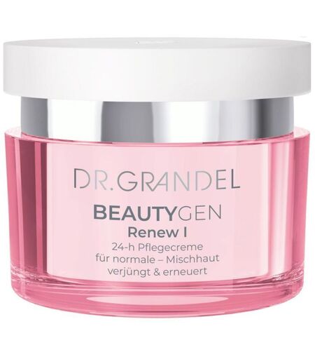 Die verjüngende Gesichtspflege Beautygen RENEW I von DR. GRANDEL:Die neueste Lösung gegen verschiedene Erscheinungen der Hautalterung: Bekämpfen Sie die Entstehung von Linien und Fältchen von Grund auf und erhalten Sie so die Jugendlichkeit Ihrer Haut so lange als möglich.RENEW I - silky touch - von DR. GRANDEL aktiviert das 'Schönheitsgen' Ihrer Haut. Durch den Extrakt aus der Schneealge werden außerdem die kollagenen Fasern geschützt und Ihre Haut erlangt neue Elastizität. Anti Age-Peptide aktivieren die Reparaturprozesse in der Haut. Die Anzahl und Tiefe von Fältchen werden sichtbar vermindert, der Alterungsprozess der Haut wird verlangsamt. Ihre Haut wirkt sichtbar gestrafft und ebenmäßig. Spüren Sie, wie die sehr leichte Gesichtspflege sofort einzieht und ein geschmeidiges Hautgefühl hinterlässt und Ihre Haut sofort angenehm frisch aussieht und zart-blumig duftet.Richtige Anwendung der verjüngenden Gesichtspflege RENEW I von DR. GRANDEL:Morgens und abends nach Reinigung und der Augenpflege mit Beautygen RENEW EYE & LIP RENEW I auf Gesicht, Hals und Dekolleté auftragen.Verpackung:TiegelInhaltsstoffe:Aqua (Water), Glycerin, Pentylene Glycol, Cyclopentasiloxane, Cyclohexasiloxane, Squalane, Distarch Phosphate, C12-15 Alkyl Benzoate, Rosa Canina Fruit Oil, Dimethicone, Glyceryl Stearate, Cetearyl Alcohol, Butyrospermum Parkii (Shea Butter), Theobroma Cacao (Cocoa) Seed Butter, Potassium Palmitoyl Hydrolyzed Wheat Protein, Butylene Glycol, Acrylates/C10-30 Alkyl Acrylate Crosspolymer, Dimethicone Crosspolymer, Chlamydomonas Extract, Palmitoyl Oligopeptide, Palmitoyl Tetrapeptide-7, Lecithin, Isomalt, Methylsilanol Mannuronate, Xanthan Gum, Disodium EDTA, Sodium Hydroxide, Carbomer, Coco-Glucoside, Sodium Lactate, Tocopherol, Ascorbyl Palmitate, Hydrogenated Palm Glycerides Citrate, Lactic Acid, Sodium Benzoate, Sorbic Acid, Phenoxyethanol, Limonene, Parfum (Fragrance) ...