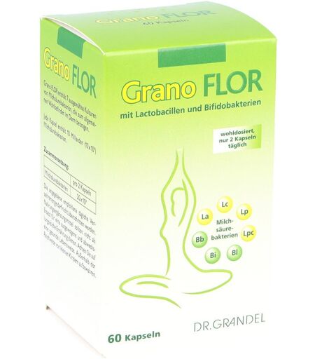 Wirkstoffe / Inhaltsstoffe / ZutatenZutaten von Granoflor probiotisch Grandel Kapseln: Trennmittel Cellulose, Milchsäurebakterien (Lactobacillus acidophilus, Bifidobacterium lactis, Lactobacillus plantarum, Lactobacillus casei, Lactobacillus paracasei, Bifidobacterium breve, Bifidobacterium longum), Trennmittel Magnesiumsalze der Speisefettsäuren. Vegetarische Kapselhülle: Hydroxypropylmethylcellulose.GegenanzeigenBei bekannter Überempfindlichkeit gegenüber einem der oben genannten Inhaltsstoffe sollte dieses Produkt nicht angewendet werden.DosierungZwei Kapseln täglich während einer Mahlzeit mit etwas Flüssigkeit unzerkaut schlucken.HinweiseDie angegebene empfohlene tägliche Verzehrsmenge darf nicht überschritten werden. Nahrungsergänzungsmittel sollten nicht als Ersatz für eine ausgewogene und abwechslungsreiche Ernährung dienen. Achten Sie auf eine gesunde Lebensweise. Außerhalb der Reichweite von kleinen Kindern aufbewahren. Granoflor probiotisch Grandel Kapseln können in Ihrer Versandapotheke www.juvalis.de erworben werden. ...