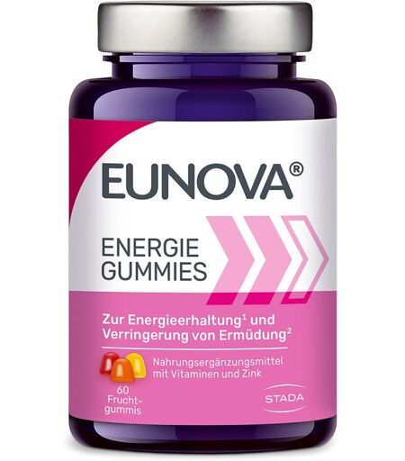 Anwendungsgebiet von Eunova Energie GummiesEunova Energie Gummies sind ein Nahrungsergänzungsmittel mit Vitaminen und Zink, mit fruchtigem Geschmack. EUNOVA® ENERGIE GUMMIES - ZUR ENERGIEERHALTUNG¹ UND VERRINGERUNG VON ERMÜDUNG² Laut der nationalen Verzehrstudie³ sind einige Erwachsene nicht optimal mit allen Nährstoffen versorgt. Bereits ein Gummi täglich unterstützt den Energiestoffwechsel und unterstützt Sie dabei, im Job und im Alltag leistungsfähiger zu sein. Dabei legen besonders Menschen mit einem aktiven Lebensstil besonderen Wert darauf, umfassend versorgt zu sein. Mit EUNOVA® Energie Gummies können Sie Ihre Extra-Portion Vitamine ganz einfach und lecker naschen. Die sorgfältig dosierten Inhaltsstoffe sind auf die Bedürfnisse von Erwachsenen und Jugendlichen abgestimmt und ergänzen eine gesunde Ernährung. So genießen Sie jeden Tag energiereich. ¹ Vitamin C, B3, B5, B7 und B12 tragen zu einem normalen Energiestoffwechsel bei. ² Vitamin C, B3, B5, B9 und B12 tragen zur Verringerung von Müdigkeit und Ermüdung bei. ³ Verzehrsstudie II: Ergebnisbericht Teil 2. Hrsg.: Max Rubner-Institut, Bundesforschungsinstitut für Ernährung und Lebensmittel, 2008. ⁴ Biotin, B3, B12 und Vitamin C tragen zur normalen psychischen Funktion bei ⁵ Pantothensäure trägt zu einer normalen geistigen Leistung bei ⁶ Vitamin E trägt dazu bei, die Zellen vor oxidativem Stress zu schützen ⁷ Vitamin D und Vitamin K tragen zur Erhaltung normaler Knochen bei ⁸ Vitamin D trägt zur Erhaltung einer normalen Muskelfunktion und zu einer normalen Funktion des Immunsystems bei ⁹ Zink trägt zu einem normalen Kohlenhydrat-Stoffwechsel und einer normalen kognitiven Funktion bei HÄUFIGE FRAGEN & ANTWORTEN Für wen sind EUNOVA® Energie Gummies geeignet? EUNOVA® Energie Gummies eignen sich für Erwachsene und Jugendliche ab 15 Jahren. Welche Geschmacksrichtu ...