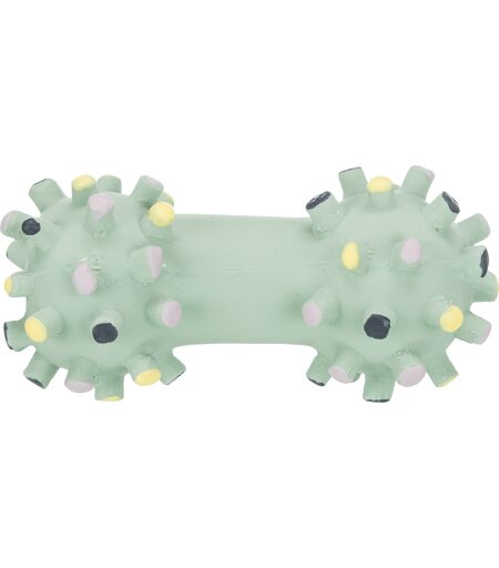 Gewichte stemmen mal anders: Die Trixie Junior Mini-Hantel lässt sich dank ihres geringen Gewichts mühelos anheben und tragen und lädt Ihren Hund mit ihrer weichen Beschaffenheit zum Kauen und Spielen ein – perfekt für neugierige Hundewelpen. Das Welpenspielzeug besteht aus flexiblem Latex, das sich durch zahnschonende Eigenschaften auszeichnet. Die Oberfläche der Trixie Junior Mini-Hantel ist mit kleinen Noppen besetzt, was ihr eine griffige Haptik verleiht. So lässt sich das Latexspielzeug problemlos fassen, anheben und herumtragen. Vorteil für schreckhafte Hundekinder: Die kleine Hantel enthält keinen Squeaker und ermöglicht so ein geräuschloses Spielen. Trixie Junior Mini-Hantel im Überblick: Welpenspielzeug in Hantelform mit kleinen Noppen Ideal zur Beschäftigung, zum Herumtragen und Kauen Aus flexiblem Latex: weich und zahnschonend Einfach zu greifen: leicht und griffig mit Noppen-Oberfläche Geräuschloser Spielspaß: ohne Squeaker, gut für schreckhafte Welpen geeignet Farbe: mint mit bunten Noppen Material: Latex Größe: ca. L 10 x Ø 3,5 cm Allgemeine Information zu Latex-Spielzeugen: Besonders Besitzer junger Hunde sollten bevorzugt Latexspielzeuge verwenden, da junge Hunde noch sehr spitze Zähne haben und dazu neigen, auf einem Spielzeug nicht nur "herumzubeißen", sondern es sogar komplett zu zerbeißen. Hierbei könnten Teile davon verschluckt werden. Da Latex im Magen- und Darmtrakt jedoch nicht aushärtet und im Normalfall problemlos ausgeschieden wird, ist das Verschlucken eines kleinen Stückchens dieses Materials in der Regel unbedenklich. Hinweis: Wie bei jedem anderen Produkt, sollten Sie Ihr Tier bei der Beschäftigung mit diesem Spielzeug beaufsichtigen. Bitte überprüfen Sie das Produkt regelmäßig auf Schäden, und ersetzen Sie das Spielzeug, wenn es defekt ist oder wenn Teile verloren gehen, da ansonsten eine Verletzung des Tieres nicht ausgeschlossen werden kann. ...