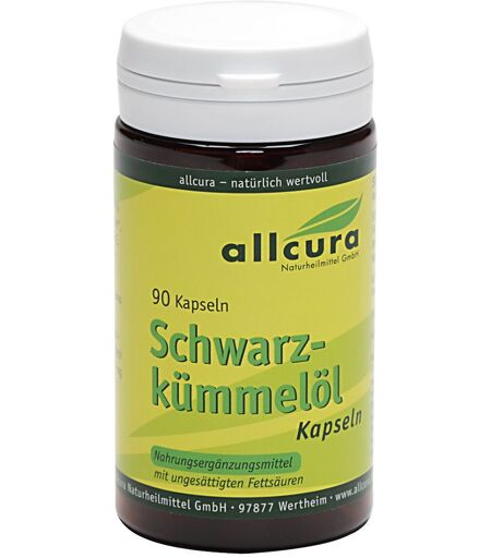Nahrungsergänzungsmittel sind kein Ersatz für eine ausgewogene und abwechslungsreiche Ernährung und eine gesunde Lebensweise.Bio-Schwarzkümmelöl Nahrungsergänzungsmittel mit essentiellerFettsäureZutaten: Schwarzkümmelöl (69,44%) (aus Nigella sativa L.), Gelatine*, Feuchthaltemittel: Glycerin*, Stabilisator:DL-α-Tocopherylacetat (Vitamin E). *= Bestandteile der Kapselhülle. pro 4 Kapseln Schwarzkümmelöl 2 g Linolsäure 1020 mg Verzehrsempfehlung: 2 x täglich 2 Kapseln mit etwasFlüssigkeit verzehren.Hinweis:Die angegebene empfohlene Tagesmenge darf nicht überschritten werden. Aufbewahrung: Kühl (6-25 °C) und lichtgeschützt lagern. Außerhalb der Reichweite von kleinen Kindern aufbewahren.Nettofüllmenge: 90 Kapseln à 720 mg = 65 g.Herstellerdaten: allcura Naturheilmittel GmbH97877 Wertheim ...