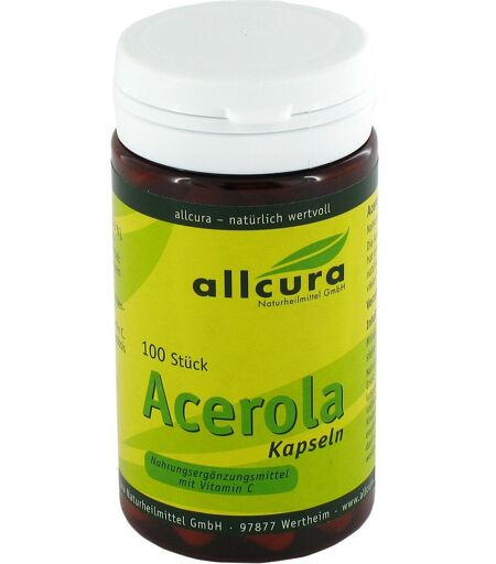 Anwendungsgebiet von Acerola KapselnAcerola Kapseln ist ein Nahrungsergänzungsmittel mit Vitamin C. Die Acerolakirsche (Malpighia punicifolia) verfügt über einen hohen Gehalt an natürlichem Vitamin C. Vitamin C unterstützt eine normale Funktion des Immun- und Nervensystems. Es trägt außerdem zur Verringerund von Müdigkeit und Ermüdung bei.Wirkstoffe / Inhaltsstoffe / ZutatenZutaten von Acerola Kapseln: Acerola Fruchtpulver (78,16 %),Hydroxypropylmethylzellulose (Kapselhülle) Trennmittel: Magnesiumsalze der Speisefettsäuren (pflanzlich) und Siliciumdioxid. 2 Kapseln enthalten: 630 mg Acerola Fruchtpulver mit 100 mg Vitamin C (entspricht 125 % der Referenzmenge für die tägliche Zufuhr gemäß EU 1169/2011)GegenanzeigenBei bekannter Überempfindlichkeit gegenüber einen der oben genannten Inhaltsstoffe sollte das Produkt nicht angewendet werden.DosierungVerzehrempfehlung von Acerola Kapseln: 2 x täglich 1 Kapsel verzehren.HinweiseNahrungsergänzungsmittel sollten nicht als Ersatz für eine ausgewogene u nd abwechslungsreiche Ernährung sowie eine gesunde Lebensweise verwendet werden. Sie sollten außerhalb der Reichweite von kleinen Kindern aufbewahrt werden. Die angegebene empfohlene tägliche Verzehrsmenge darf nicht überschritten werden. Acerola Kapseln können in Ihrer Versandapotheke www.juvalis.de erworben werden. ...