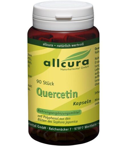 Nahrungsergänzungsmittel sind kein Ersatz für eine ausgewogene und abwechslungsreiche Ernährung und eine gesunde Lebensweise. Was ist Quercetin? Quercetin ist ein natürlicher Pflanzenstoff, der zur Gruppe der Flavonoide gehört. Quercetin kommt insbesondere in Obst und Gemüse mit kräftigen Farben wie Äpfeln, Beeren, Zwiebeln und dunklem Blattgemüse vor. Der menschliche Körper kann Bioflavonoide nicht selbst produzieren, weshalb diese über die Nahrung oder Nahrungsergänzungsmittel zugeführt werden müssen. allcura Quercetin Kapseln enthalten 250 mg Quercetin, welches aus dem Blütenextrakt des japanischen Schnurbaums (Sophora japonica) gewonnen wird. Was sind freie Radikale? Freie Radikale sind Nebenprodukte des menschlichen Stoffwechsels und bilden sich kontinuierlich in den Zellen des Körpers. Faktoren wie z.B. Umweltverschmutzung, Rauchen und Stress begünstigen die Entstehung von freien Radikalen. Als Sauerstoffmoleküle mit nicht gepaarten Elektronen neigen sie dazu, anderen Atomen oder Molekülen Elektronen zu entziehen. Durch diese Interaktion entstehen neue Radikale, die ähnliche Elektronenentzugsreaktionen hervorrufen. Dieser fortlaufende Prozess führt zu einer Kettenreaktion und resultiert in oxidativem Stress. In welchen Lebensmitteln ist viel Quercetin enthalten? Quercetin ist in vielen Lebensmitteln, insbesondere in Obst und Gemüse mit kräftigen Farben wie Äpfeln, Heidelbeeren, Erdbeeren, Himbeeren und Preiselbeeren, roten und gelben Zwiebeln, Knoblauch, dunklem Blattgemüse wie Grünkohl, Spinat und Grünkohl sowie in grünem und schwarzem Tee enthalten. Quercetin aus dem Schnurbaum Der Schnurbaum ist ein Baum der in der Blütezeit von Juli bis August Bienen, Hummeln und anderen Insekten viel Nektar bietet. Die Pflanze stammt ursprünglich aus Japan, Korea und China und ist daher auch als japanischer Schnurbaum bekannt. Andere geläufige Namen sind Perlschnurbaum, Honigbaum oder Pagodenbaum. Quercetin wird aus dem Blütenextrakt gewonnen. Was ist oxidativer Stress? Von oxidativem Stress spricht man, wenn in unserem Körper ein Ungleichgewicht zwischen sogenannten freien Radikalen und antioxidativen Abwehrmechanismen besteht. Freie Radikale sind instabile Moleküle, die durch bestimmte Lebensstilfaktoren wie eine unausgewogene Ernährung, mangelnde körperliche Aktivität, Rauchen, Umweltverschmutzung, oder chronischem Stress die Belastung durch oxidativen Stress erhöhen. Zutaten: Blütenextrakt des japanischen Schnurbaums (Sophora japonica) (70%), Hydroxypropylmethylcellulose (Kapselhülle), Kartoffelstärke, Pflanzenöl (Kokosnuss) Nährwertangaben: Nährwerte pro 1 Kapsel Blütenextrakt Sophora japonica 260 mg Quercetin 250 mg Verzehrempfehlung: Es sollte täglich eine allcura Quercetin Kapsel mit einem Glas Wasser eingenommen werden. Hinweis: Die angegebene empfohlene Tagesmenge darf nicht überschritten werden. Aufbewahrung: Kühl (6-25 °C) und lichtgeschützt lagern. Außerhalb der Reichweite von kleinen Kindern aufbewahren. Nettofüllmenge: 500 g... ...
