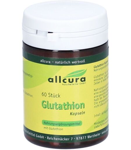 Nahrungsergänzungsmittel sind kein Ersatz für eine ausgewogene und abwechslungsreiche Ernährung sowie eine gesunde Lebensweise. Die angegebene empfohlene tägliche Verzehrmenge darf nicht überschritten werden. Außerhalb der Reichweite von kleinen Kindern lagern.allcura Glutathion Kapseln reduziert 250 mgNahrungsergänzungsmittel mit Glutathion. Glutathion ist ein Tripetid, das aus drei Aminosäuren Glutaminsäure, Cystein und Glycin gebildet wird. Es ist in fast allen Zellen in hoher Konzentration enthalten.Zutaten:L-Glutathion reduziert, Hydroxypropylmethylcellulose (Kapselhülle)Verzehrempfehlung:1 Kapsel täglich mit Wasser verzehren.Hinweis:Nahrungsergänzungsmittel sind kein Ersatz für eine ausgewogene und abwechslungsreiche Ernährung sowie eine gesunde Lebensweise. Die angegebene empfohlene tägliche Verzehrmenge darf nicht überschritten werden. Außerhalb der Reichweite von kleinen Kindern lagern.Aufbewahrung:Kühl und lichtgeschützt lagern. Außerhalb der Reichweite von kleinen Kindern aufbewahren.Nettofüllmenge:60 Kapseln (19,8 g)Herstellerdaten:allcura Naturheilmittel GmbHReichenäcker 797877 Wertheim ...