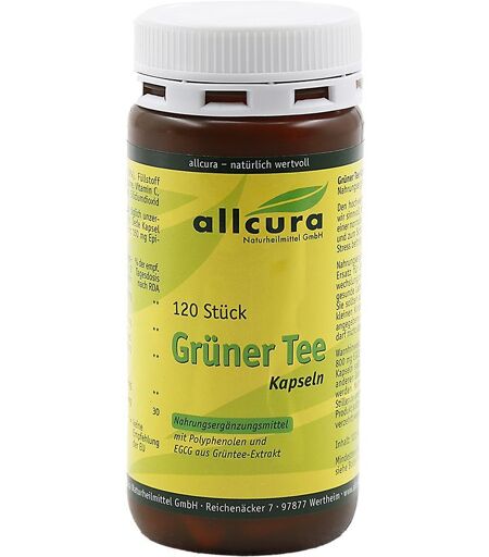 Sollte nicht konsumiert werden, wenn Sie am selben Tag andere Produkte konsumieren, die grünen Tee enthalten. Sollte nicht von schwangeren oder stillenden Frauen und Kindern unter 18 Jahren konsumiert werden.Sollte nicht auf nüchternen Magen konsumiert werdenNahrungsergänzungsmittel sind kein Ersatz für eine ausgewogene und abwechslungsreiche Ernährung und eine gesunde Lebensweise. Grüner Tee wird von der gleichen Pflanze (Camellia sinensis) gewonnen wie Schwarztee. Im Gegensatz zum Schwarztee werden beim Grüntee die Teeblätter nicht fermentiert, sondern schonend gedämpft und getrocknet. Als besonders interessante Inhaltsstoffe gelten die Catechine, die dem Tee den bitteren Geschmack verleihen. Erwähnenswert ist das Epigallocatechingallat (EGCG). Den hochwertigen Grüntee Extrakt haben wir mit Vitamin C ergänzt, das zu einer normalen Funktion des Immunsystems und zum Schutz der Zellen vor oxidativem Stress beiträgt. Zutaten: Grüntee Extrakt (68%), Füllstoff mikrokristalline Cellulose, Gelatine (Kapselhülle), Vitamin C, Trennmittel: Magnesiumsalze der Speisefettsäuren, Siliciumdioxid. Nährwerttabelle Nährstoff pro Kapsel Pro Tagesdosis 2 Kapseln % der empf. Tagesdosis nach NRV* Grüner Tee 400 mg 800 mg ** davon 95% Polyphenole 380 mg 760 mg ** Davon 65% Catechine 260 mg 520 mg ** Davon 40% EGCG 160 mg 320 mg ** Vitamin C 12 mg 24 mg 30 * = Prozentsatz der Referenzwerte für die tägliche Zufuhr gemäß der VO (EU) 1169/2011 ** = keine Empfehlung der EU Verzehrempfehlung: 2 Kapseln täglich. Jede Kapsel enthält 380 mg Polyphenole mit 160 mg Epigallocatechingallat (EGCG). Hinweise: Pro Tag sollen nicht mehr als 800 mg EGCG verzehrt werden. Grüner Tee Kapseln sollten nicht am selben Tag mit anderen Grüntee Produkten konsumiert werden. Nicht geeignet für Schwangere, Stillende und Kinder unter 18 Jahren. Das Produkt sollte nicht auf nüchternen Magen verzehrt werden. Nahrungsergänzungsmittel sollten nicht als Ersatz für eine ausgewogene und abwechslungsreiche Ernährung sowie gesunde Lebensweise verwendet werden. Sie sollten außerhalb der Reichweite von kleinen Kindern aufbewahrt werden. Die angegebene empfohlene tägliche Verzehrsmenge darf nicht überschritten werden. Nettofüllmenge: 120 Kapseln = 70 g Hersteller: allcura Naturheilmittel GmbH Reichenäcker 7 97877 Wertheim ...