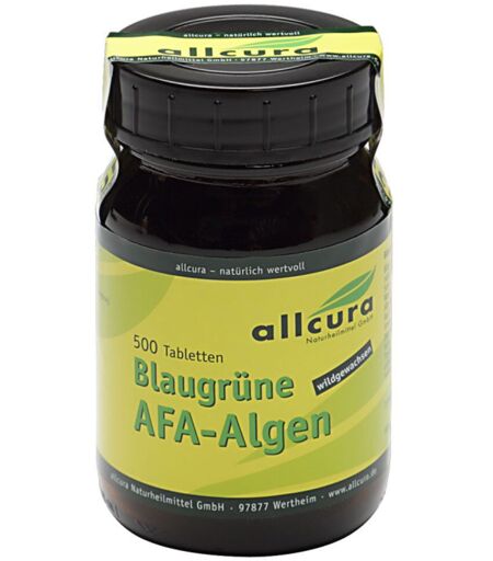 Nahrungsergänzungsmittel sind kein Ersatz für eine ausgewogene, abwechslungsreiche Ernährung und eine gesunde Lebensweise.Wildgewachsen im Naturschutzgebiet des Oberen Klamathsees, OregonDie blaugrünen Uralgen sind winzige Einzeller, die ersten Sauerstoffbildner unseres Planeten.Ihr botanischer Name ist Aphanizomenon flos aquae, kurz genannt AFA - Alge. Ihre Zellwand besteht nicht aus Zellulose, sondern aus gut verdaulichem Protein. Afa-Algen werden als Mini-Snack für Zwischendurch immer beliebter.Afa-Algen werden nach der Ernte schonend gereinigt und nach dem neuen besonders schonenden RW-S Verfahren getrocknet.Ohne Bindemittel.Zutaten:Afa-Algenpulver (Aphanizomenon Flos Aquae).Nährwerte:NÄhrwertangabenpro 100 gEnergie1537 kj / 365 kcalFett4,4 gdavon gesättigte Fettsäuren1,1 gKohlenhydrate15,9 gdavon Zucker0,4 gBalaststoffe3,0 gEiweiß63,5 gSalz0,5 g Verzehrempfehlung: 1 - 8 Tabletten über den Tag verteilt zu sich nehmen.Hinweis:Die angegebene empfohlene tägliche Verzehrmenge darf nicht überschritten werden.Lagerung:Außerhalb der Reichweite von kleinen Kindern lagern.Nettofüllmenge:500 Stück à 250 mg = 125gHersteller:allcura Naturheilmittel GmbHReichenäcker 797877 Wertheim ...