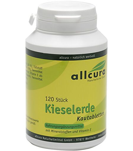 Nahrungsergänzungsmittel sind kein Ersatz für eine ausgewogene und abwechslungsreiche Ernährung und eine gesunde Lebensweise.Kieselerde KautablettenWohlschmeckende Kautabletten mit den MineralstoffenKieselerde und Calcium. Calcium trägt zur Erhaltung normaler Knochen und Zähne, zu einem normalen Energiestoffwechsel und zu einer normalen Muskelfunktion bei. Vitamin E trägt dazu bei, die Zellen vor oxidativem Stress zu schützen.Zutaten: Zucker, Dextrose, Kieselerde (20 %), Füllstoff mikrokristalline Cellulose, Calciumcarbonat (10%), Trennmittel Siliciumdioxid, Säurungsmittel Citronensäure, Vitamin E als DL-alpha-Tocopherolacetat (1,5%), Maltodextrin, TrennmittelCalciumsalze von Speisefettsäuren, Aroma. Nährwertangaben pro 3 Kautabletten % Referenzwert Calcium 120 mg 15 % Kieselerde 600 mg - Vitamin E 27,0 mg 225 % Verzehrsempfehlung: 3 Tabletten täglich.Hinweis:Die angegebene empfohlene Tagesmenge darf nicht überschritten werden. Aufbewahrung: Kühl (6-25 °C) und lichtgeschützt lagern. Außerhalb der Reichweite von kleinen Kindern aufbewahren.Nettofüllmenge: 120 Kautabletten à 1 g = 120 gHerstellerdaten: allcura Naturheilmittel GmbH97877 Wertheim ...