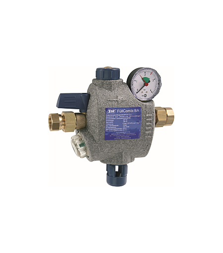 Syr FüllCombi BA 662820000 DN 20. FüllCombi BA, zur automatischen Befüllung von geschlossenen Heizungsanlagen. Mit Absperrung, Druckminderer, Mano- meter, Systemtrenner BA nach DIN EN 1717 bis einschließlich Flüssigkeitskatgorie 4. Ausgangsdruck des Druckminderers regelbar von 0,5 bis 4 bar. Werkseitig auf 1,5 bar voreingestellt. Integrierter Schmutzfänger aus Nirogewebe, Manometer- anschluß G 1/4. Max. Betriebstemperatur 65 C. Gehäuse aus Pressmessing. Mit beidseitigen Verschraubungen und Wärmedämmschale, DN 20. ...