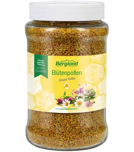 Bitte achten Sie auf eine abwechslungsreiche und ausgewogene Ernährung und gesunde Lebensweise.Bergland BlütenpollenBlütenpollen sind die wertvollen Pflanzenkeimzellen. Sie werden von den Sammelbienen bei der Nektarsuche gesammelt und zu Pollenkörnern geknetet. Sie dienen mit ihren Inhaltsstoffen als Kraftfutter für die Bienen.Zutaten:Ganze Blütenpollen. pro 100 g Energie 1586 kJ / 376 kcal Fett 7 g davon gesättigte Fettsäuren 2,3 g davon mehrfach ungesättigte Fettsäuren 3,8 g Kohlenhydrate 58 g davon Zucker 36 g Eiweiß 16 g Salz < 0,025 g Verzehrsempfehlung:Täglich 1 gehäuften Teelöffel wahlweise mit etwas Flüssigkeit, Müsli oder Joghurt verzehren.Hinweis:Die angegebene empfohlene Tagesmenge darf nicht überschritten werden. Aufbewahrung: Kühl (6-25 °C) und lichtgeschützt lagern. Außerhalb der Reichweite von Kindern aufbewahren.Nettofüllmenge: 500 gHerstellerdaten: Bergland Pharma GmbH & Co. KGAlpenstraße 1587751 Heimertingen/Allgäu ...