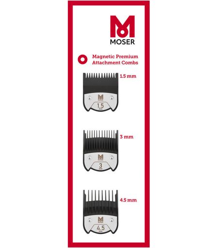 Premium Magnet-Aufsteckkämme in Faltschachtel (1,5 / 3 / 4,5 mm). Dank des Magnetsystems lassen sich die innovativen Aufsteckkämme spielend leicht und intuitiv auf alle abnehmbaren MOSER Schneidsätze aufsetzen. Ein kurzer Klick des MAGCLICK®-Systems bestätigt das sichere Einrasten des Aufsteckkammes auf den Schneidsatz. Ein spezieller, formstabiler Mineralkunststoff gewährleistet die dauerhafte Passgenauigkeit sowie Resistenz gegen im Salon verwendete Chemikalien, so dass die Stabilität der Aufsteckkämme auch langfristig erhalten bleibt. ...