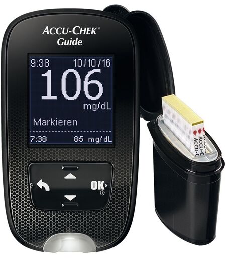 InhaltACCU-CHEK® Guide Messgerät mit Batterien10 ACCU-CHEK® Guide Teststreifen1 ACCU-CHEK® FastClix Stechhilfe1 ACCU-CHEK® Fastclix Lanzettentrommel mit 6 Lanzetten1 EtuiGebrauchsanweisung Zur Selbstanwendung geeignet. ACCU-CHEK® Guide System zur Blutzuckermessung. ACCU-CHEK® Guide macht vieles leichter Leichter Teststreifen handhaben dank der innovativen Teststreifenbox Leichter Blut auftragen durch die breitere Blutauftragsfläche Leichter im Dunkeln messen durch den beleuchteten Teststreifeneinschub Leichter hygienisch Teststreifen entsorgen durch den Auswurfknopf Wählen Sie aus 20 Sprachen u.a. Deutsch, Englisch, Italienisch, Russisch oder Türkisch. ...