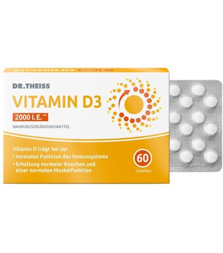 Anwendungsgebiet von Dr. Theiss Vitamin D3 Tabletten 2000 I.E.Dr. Theiss Vitamin D3 Tabletten 2000 I.E. ist ein Nahrungsergänzungsmitteln mit Vitamin D. Viele Menschen in Deutschland nehmen nicht ausreichend Vitamin D über Sonnenlicht und die Ernährung auf⁴. Eine gezielte Ergänzung kann daher besonders in den sonnenarmen Monaten hilfreich sein, um den Körper mit ausreichend Vitamin D zu versorgen.Dr. Theiss Vitamin D3 Tabletten 2000 I.E. sind klein und leicht einzunehmen. Dadurch eignen sie sich gut für die tägliche Anwendung. Vitamin D trägt zu einer normalen Funktion des Immunsystems*, zur Erhaltung normaler Knochen** sowie zu einer normalen Muskelfunktion*** bei.Die Tabletten sind frei von Gluten und Laktose und enthalten bewusst kein Vitamin K2. Dadurch bestehen keine Einschränkungen bei der Einnahme zusammen mit Medikamenten, die durch Vitamin K beeinflusst werden könnten.* Vitamin D trägt zu einer normalen Funktion des Immunsystems bei.** Vitamin D trägt zur Erhaltung normaler Knochen bei.*** Vitamin D trägt zur Erhaltung einer normalen Muskelfunktion bei.⁴ Nationale Verzehrstudie II, Ergebnisbericht Teil 2. Max Rubner-Institut, Karlsruhe, 2008.Wirkstoffe / Inhaltsstoffe / ZutatenZuatten von Dr. Theiss Vitamin D3 Tabletten 2000 I.E.:Füllstoffe: Isomalt, mikrokristalline Cellulose Cholecalciferol (Vitamin D3) Verdickungsmittel: Hydroxypropylmethylcellulose Trennmittel: Magnesiumsalze der Speisefettsäuren.GegenanzeigenBei bekannter Überempfindlichkeit gegenüber einem der oben genannten Inhaltsstoffe sollte das Produkt nicht angewendet werden.DosierungVerzehrempfehlung von Dr. Theiss Vitamin D3 Tabletten 2000 I.E.: Einmal täglich eine Tablette zu einer Mahlzeit mit etwas Flüssigkeit einnehmen.HinweiseNahrungsergänzungsmittel sollten nicht als Ersatz für eine ausgewogene und abwechslungsreiche Ernährung und eine gesunde Lebensweise dienen. Die angegebene empfohlene tägliche Verzehrmenge darf nicht überschritten werden. Schwangeren, S ...