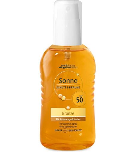 Anwendungsgebiet von Sonne Schutz & Bräune Spray Bronze Lsf 50Das Sonne Schutz & Bräune Spray Bronze Lsf 50 von medipharma cosmetics ist eine Kombination aus zuverlässigem, hohem Sonnenschutz und einer natürlichen, intensivierten Bräune – ganz ohne Selbstbräuner. Das ultraleichte, transparente Sonnenspray eignet sich sowohl für das Gesicht als auch für den Körper und schützt vor intensiver Sonneneinstrahlung mit dem hohen Lichtschutzfaktor 50. Ein essenzieller Bestandteil des Sonnensprays ist der Pro-Melanin-Extrakt, der die natürliche Melaninproduktion anregt und so die Bräunung unterstützt. Dies unterstützt die Entwicklung eines gleichmäßigen, gebräunten Teints, der sich harmonisch mit der natürlichen Hautfarbe verbindet. Vitamin E wirkt zudem antioxidativ und stärkt die Hautbarriere, um Ihre Haut während des Sonnenbadens zu pflegen und zu schützen.Das Pump-Spray lässt sich leicht auftragen, zieht rasch ein, klebt nicht und gewährleistet Schutz, der auch beim Schwimmen oder sportlichen Betätigungen bestehen bleibt. Die Textur fühlt sich angenehm zart auf der Haut an und hinterlässt kein fettiges Gefühl. Zudem ist die Formel frei von Octocrylenen, Octinoxaten und Oxybenzonen. Das Sonne Schutz & Bräune Spray Bronze Lsf 50 von medipharma cosmetics verbindet zuverlässigen, hohen Sonnenschutz mit einer Unterstützung der natürlichen Bräune und ist somit der sommerliche Begleiter für alle, die nicht nur geschützt, sondern auch zart gebräunt die Sonne genießen möchten.Nur das Beste für die Haut: Nach diesem Grundsatz hat medipharma cosmetics verschiedene Produkte zum Sonnenschutz entwickelt. Die Sonnenpflegeprodukte bieten eine breite Auswahl an Pflegeprodukten, die auf die unterschiedlichen Bedürfnisse der Haut abgestimmt sind. Sie beruhen auf jahrelanger Forschung und Entwicklung und werden unter strengen Qualitätskontrollen hergestellt – für einen zuverlässigen Schutz und intensive Pflege der Haut.Eigenschaften: Transparent ...