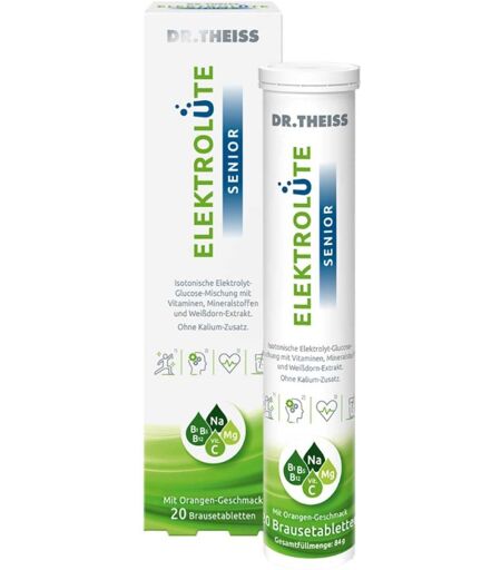 Anwendungsgebiet von Dr.Theiss Elektrolüte Senior BrausetablettenIm besten Alter beginnt ein neues Kapitel – eines, in dem Sie selbst entscheiden, wie aktiv und lebendig es wird. Ob eine Wanderung in der Natur, die Arbeit im Garten oder das Fußballspielen mit dem Enkel: Jetzt ist die Zeit, all das zu tun, was früher oft warten musste.Gerade in den späteren Lebensjahren verändert sich der Nährstoffbedarf des Körpers – nicht aber der Wunsch, aktiv und vital durchs Leben zu gehen. Elektrolyte spielen dabei eine wichtige Rolle: Sie unterstützen verschiedene physiologische Funktionen im Körper. Daher ist die Aufrechterhaltung eines ausgewogenen Verhältnisses von Elektrolyten und eine ausreichende Flüssigkeitsaufnahme wichtig – vor allem an ereignisreichen Tagen.Dr.Theiss Elektrolüte Senior Brausetabletten enthält ausgewählte Elektrolyte und Vitamine, die wichtige Funktionen im menschlichen Körper unterstützen:- Vitamin C und Vitamin B12 tragen zu einem normalen Energiestoffwechsel und zur Verringerung von Müdigkeit und Ermüdung bei. - Vitamin B5 trägt zu einer normalen geistigen Leistung bei. - Vitamin B1 trägt zu einer normalen Herzfunktion bei.- Magnesium trägt zum Elektrolytgleichgewicht bei.- Mit Weißdorn-Extrakt.Bei der Rezeptur wurde bewusst auf einen Zusatz von Kalium verzichtet. Somit eignet sich Dr.Theiss Elektrolüte Senior Brausetabletten auch für alle, die auf ihre Kaliumaufnahme achten sollten.Bleiben Sie vital im Alter - mit Dr.Theiss Elektrolüte Senior Brausetabletten.Eigenschaften: - Ohne Kalium-Zusatz- Mit Weißdorn-Extrakt- Mit Vitamin B1, Vitamin B5, Vitamin C, Vitamin B12 und Magnesium- Für einen vitalen & aktiven AlltagWirkstoffe / Inhaltsstoffe / ZutatenZutaten von Dr.Theiss Elektrolüte Senior Brausetabletten:Säuerungsmittel: Citronensäure Glucose (21 %) Säureregulator Natriumhydrogencarbonat Magnesiumcitrat Aroma (Orange) Natriumchlorid Farbstoff: Carotin Weißdorn-Extrakt (0,6 %) L-Ascorbinsäure (Vitami ...