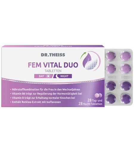 Anwendungsgebiet von DR. THEISS Fem Vital Duo TablettenDR. THEISS Fem Vital Duo Tabletten - Tag- & Nacht-Tabletten für mehr Wohlbefinden in den Wechseljahren. Die Duo Tabletten unterstützen bei Ermüdung mit verschiedenen Vitaminen den Körper in den Wechseljahren.Wirkstoffe / Inhaltsstoffe / ZutatenDR. THEISS Fem Vital Duo Tabletten enthält: Rotklee Extrakt (Trifolium pratense L.) Füllstoff: mikrokristalline Cellulose Magnesiumoxid Zinkcitrat Zitronenmelissen Extrakt (Melissa offi cinalis L.) DL-alpha Tocopherylacetate (Vitamin E) Überzugsmittel (Verdickungsmittel: Hydroxypropylmethylcellulose Calciumcarbonat Bindemittel: Talcum, Polyethylenglycol Füllstoff: mikrokristalline Cellulose mittelkettige Triglyceride Farbstoffe: E120, E132) LAscorbinsäure (Vitamin C) Cholecalciferol (Vitamin D) Hopfenzapfen Extrakt (Humulus lupulus L.) Trennmittel: Magnesiumsalze der Speisefettsäuren Chrom(III)-chlorid Pyridoxinhydrochlorid (Vitamin B6).GegenanzeigenBei bekannter Überempfindlichkeit gegenüber einen der oben genannten Inhaltsstoffe sollte dieses Produkt nicht angewendet werden.DosierungVerzehrempfehlung von DR. THEISS Fem Vital Duo Tabletten: Pro Tag jeweils eine Tag-Tablette am Morgen und eine Nacht-Tablette am Abend mit Wasser einnehmen. Die empfohlene Tagesdosis darf nicht überschritten werden. InformationDR. THEISS Fem Vital Duo Tabletten – Tag - & Nacht-Tabletten für mehr Wohlbefinden in den Wechseljahren Nahrungsergänzungsmittel mit Vitamin B6, C, D, E, Chrom, Magnesium und Zink. Ergänzt mit Extrakten aus Hopfenzapfen, Rotklee und Zitronenmelisse. In den Wechseljahren beginnt im weiblichen Körper eine Umstellung der Hormonproduktion. Während diesem natürlichen Prozess kann es zu Begleiterscheinungen wie z. B. Hitzewallungen und Müdigkeit kommen, die das Wohlbefinden beeinträchtigen. Der Körper leistet in dieser Zeit der Umstellung viel und ka ...