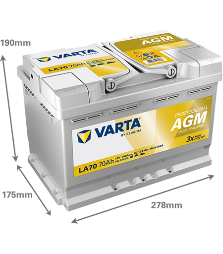 VARTA Starterbatterie PROFESSIONAL DUAL PURPOSE AGM 12 V, 70 Ah, 760 A Die Professional AGM-Batterie ist darauf ausgelegt, Off-Grid-Abenteuer zu unterstützen und bietet außergewöhnliche Leistung und Zuverlässigkeit über längere Zeiträume. Eine Batterie, die mitkommt und die Freiheit bietet, weiter zu erkunden und länger zu bleiben.? Entwickelt in Deutschland, liefern VARTA-Batterien präzise Leistung und langanhaltende Zuverlässigkeit.?Länge [mm]:278 mm Endpolart:1 Höhe [mm]:190 mm Batterie-Kapazität 5h [Ah]:60 Ah Bodenleistenausführung B13 Spannung [V]:12 V Batterie-Kapazität [Ah]:70 Ah Batterie:AGM-Batterie Polanordnung 0 Kälteprüfstrom EN [A]:760 A Breite [mm]:175 mm ...