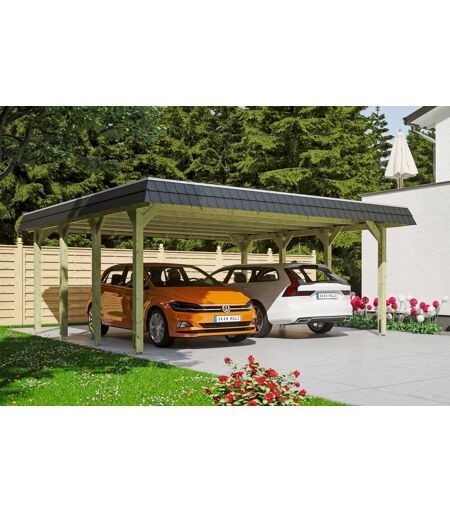 SKAN HOLZ Carport Spreewald 585 x 589 cm mit EPDM-Dach, schwarze Blende Produktnummer: 0784206043 SKAN HOLZ Carport Spreewald Flachdach-CarportAußenmaße 585 x 589 cmKonstruktion aus imprägniertem NadelholzGrün imprägniertPfosten 11,5 x 11,5 cm inkl. H-PfostenankernDacheindeckung aus 20 mm starker Dachschalung mit EPDM-Folieumlaufende schwarze Blende in Schieferoptik mit Aluminium-Abschlusskanteinkl. Kunststoff-Regenrinne mit Fallrohr Konstruktion Die Konstruktion ist aus imprägniertem Nadelholz gefertigt. Das nicht technisch getrocknete massive Fichten- bzw. Kiefernholz erhält seine grünliche Farbe durch im Imprägniermittel gelöste Metallsalze. Sie schützen das Holz gegen Pilz- und Insektenbefall, ein UV-Schutz ist jedoch nicht enthalten. Durch die Imprägnierung besitzt das Holz eine höhere Restfeuchte. Durch die anschließende Trocknung kann es zu Harzaustritt, Verdrehung bzw. Bildung von Trocknungsrissen kommen, davon geht kein statischer Nachteil aus. Dies spiegelt die Natürlichkeit der verwendeten Materialien wider. Farbliche Behandlung Die Holzteile dieses Bausatzes sind durch eine Imprägnierung auf Wasserbasis vor Pilz- und Insektenbefall geschützt. Der Bausatz kann sofort nach Anlieferung montiert werden. Die Holzoberfläche sollte frühestens nach 2-3 Sonnenmonaten weiterbehandelt werden, nachdem der Überschuss an Imprägnierung abgetrocknet ist. Vor dem Anstrich die Oberfläche leicht anschleifen und reinigen. Streichen sie die Oberfläche zweimal mit hochwertiger Holzschutzlasur. Achten sie auf einen guten UV-Schutz der Produkte sowie die Verarbeitungsrichtlinien des Lasurherstellers. Rechnen Sie mit Pflegeintervallen von ca. 4-5 Jahren, spätestens aber vor dem Eintreten sichtbarer Schäden. Beachten Sie dazu auch die Verarbeitungsrichtlinien des Lasurherstellers. Dacheindeckung Die Dacheindeckung besteht aus einer 19 mm starken Dachschalung mit EPDM-Folie. EPDM-Folie ist die einfach zu verlegende, sichere und dauerhafte Dacheindeckung für Dächer mit geringer Neigung. Sie zeichnet sich durch eine lange Lebensdauer, hohe Dehnbarkeit und hervorragenden Widerstand gegen UV-Strahlung aus. Die Verlegung erfolgt in einem Stück durch Kaltverklebung mit dem mitgeliefertem Kleber. Verankerung 60 cm lange H-Anker aus verzinktem Flachstahl zum Einbetonieren in das bauseitig erstellte Punktfundament (Größe und Ausführung siehe Montageanleitung) sind im Bausatz enthalten. Sie verbinden die Pfosten fest mit dem Untergrund und sorgen für hohe Stabilität. Die Anker liefern wir Ihnen auf Wunsch gerne zusammen mit dem passenden Fundamentplan zu. Bitte geben Sie dies, so gewünscht, unbedingt bei Bestellung mit an. Flachdach-Carport Konstruktion aus imprägniertem Nadelholz Grün imprägniert Dachschalung mit EPDM-Folie Pfosten 11,5 x 11,5 cm Breite (inkl. Dachüberstand): 585 cm Tiefe (inkl. Dachüberstand): 589 cm Breite (Sockelmaß): 553 cm Tiefe (Sockelmaß): 469 cm Gesamthöhe vorne: 250 cm Gesamthöhe hinten: 238 cm Durchfahrtshöhe vorne: 215 cm Durchfahrtshöhe... ...