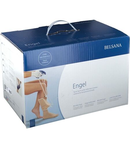 Anziehhilfe BELSANA Engel - ideal bei BewegungseinschränkungenIdeal als Anziehstation“ für zuhause und bei eingeschränkter Beweglichkeit, z. B. beim Bücken oder Beugen.Stabiler Komplettrahmen mit zwei beweglichen Griffen.Der BELSANA Engel ist die ideale Anziehstation“ für zu Hause und bei eingeschränkter Beweglichkeit. Der stabile Komplettrahmen mit den zwei beweglichen Griffen macht das Einsteigen in den Strumpf zu einem Kinderspiel.Anziehtipps Ziehen Sie die Strümpfe gleich nach dem Aufstehen an, so lange Ihre Beine noch frei von Schwellungen sind. Um das Anziehen zu erleichtern und das Gestrick zu schonen, sollten Spezial Gummihandschuhe mit Profil getragen werden. Bitte beachten Sie: Schmuck und lange Fingernagel können den Strumpf beschädigen. Den Kompressionsstrumpf nicht am Abschluss- oder Haftrand nach oben ziehen, sondern von unten nach oben mit den Händen streifen. Weitere Tipps: Bitte den Strumpf niemals aufrollen. Falls ein Strumpf in der Kniekehle zu eng erscheint, hilft es, das Gestrick mehr am Bein zu verteilen. Bei Schenkelstrümpfen: Das Haftband sollte zwei Finger breit unter dem Schritt und unter der Gesäßfalte enden, damit es sich beim Tragen nicht rollt. Bitte achten Sie darauf, dass das Haftband rund um Ihren Oberschenkel auf gleicher Höhe angelegt ist. Bei Kniestrümpfen: Das Bündchen (Oberrand) sollte mindestens zwei Finger breit unter dem Knie enden, damit es nicht in der Kniekehle einschneidet.Schritt 1: Anziehhilfe BELSANA Engel vorbereiten Schlagen Sie die Flügel“ bzw. Griffelemente des BELSANA Engels nach außen und stellen ihn wie oben abgebildet vor sich (z. B. auf einen Tisch oder aufs Bett). Wenn die schwarzen Abschlusskappen oben sind und zu Ihnen zeigen, steht die Anziehhilfe richtig um nun mit dem Aufziehen des Strumpfes zu beginnen.Schritt 2: Strumpf auf die Anziehhilfe schieben Legen Sie den Strumpf so in die Öffnung, dass die Ferse zu Ihnen und die Spitze von Ihnen wegzeigt. Anschließend den Oberrand bzw. das Haftband über die halbkreisförmige Stange schlagen.Wenn der Strumpf fixiert ist, beginnen Sie ihn mit beiden Händen kräftig und gleichmäßig auf der Anziehhilfe nach unten zu schieben.Schritt 3: Einsteigen Achten Sie auch darauf, dass Sie rundum gerade schieben. Fahren Sie so lange fort, bis die Fußspitze fast oben ist. Stellen Sie die Anziehhilfe auf den Boden und halten sie an den Griffen fest. Das können Sie auch im Sitzen tun. Nun schieben Sie Ihre Zehen kräftig in die Strumpfspitze.Schritt 4: Hochziehen ergewissern Sie sich, dass Ihre Zehen richtig in der Fußspitze sitzen. Beginnen Sie nun, den Strumpf an den Griffen gleichmäßig und gerade hochzuziehen. Zunächst über die Ferse und dann weiter hoch am Bein. Die Anziehhilfe entfernen Sie, indem Sie sie einfach nach unten aus dem umgeschlagenen Strumpf schieben.Schritt 5: Fertig anziehen Bei einer Strumpfhose das erste Bein nur bis zur Wade anziehen und dann das zweite Strumpfbein wie beschrieben vorbereiten und... ...