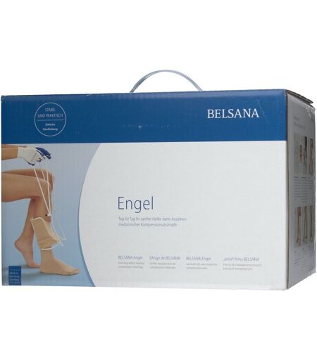 Anziehhilfe BELSANA Engel - ideal bei BewegungseinschränkungenIdeal als „Anziehstation“ für zuhause und bei eingeschränkter Beweglichkeit, z. B. beim Bücken oder Beugen.Stabiler Komplettrahmen mit zwei beweglichen Griffen.Der BELSANA Engel ist die ideale „Anziehstation“ für zu Hause und bei eingeschränkter Beweglichkeit. Der stabile Komplettrahmen mit den zwei beweglichen Griffen macht das "Einsteigen" in den Strumpf zu einem Kinderspiel.AnziehtippsZiehen Sie die Strümpfe gleich nach dem Aufstehen an, so lange Ihre Beine noch frei von Schwellungen sind.Um das Anziehen zu erleichtern und das Gestrick zu schonen, sollten Spezial Gummihandschuhe mit Profil getragen werden.Bitte beachten Sie: Schmuck und lange Fingernagel können den Strumpf beschädigen.Den Kompressionsstrumpf nicht am Abschluss- oder Haftrand nach oben ziehen, sondern von unten nach oben mit den Händen streifen.Weitere Tipps:Bitte den Strumpf niemals aufrollen.Falls ein Strumpf in der Kniekehle zu eng erscheint, hilft es, das Gestrick mehr am Bein zu verteilen.Bei Schenkelstrümpfen: Das Haftband sollte zwei Finger breit unter dem Schritt und unter der Gesäßfalte enden, damit es sich beim Tragen nicht rollt. Bitte achten Sie darauf, dass das Haftband rund um Ihren Oberschenkel auf gleicher Höhe angelegt ist.Bei Kniestrümpfen: Das Bündchen (Oberrand) sollte mindestens zwei Finger breit unter dem Knie enden, damit es nicht in der Kniekehle einschneidet.Schritt 1: Anziehhilfe BELSANA Engel vorbereitenSchlagen Sie die „Flügel“ bzw. Griffelemente des BELSANA Engels nach außen und stellen ihn wie oben abgebildet vor sich (z. B. auf einen Tisch oder aufs Bett).Wenn die schwarzen Abschlusskappen oben sind und zu Ihnen zeigen, steht die Anziehhilfe richtig um nun mit dem Aufziehen des Strumpfes zu beginnen.Schritt 2: Strumpf auf die Anziehhilfe schiebenLegen Sie den Strumpf so in die Öffnung, dass die Ferse zu Ihnen und die Spitze von Ihnen wegzeigt. Anschließend den Oberrand bzw. das Haftband über die halbkreisförmige Stange schlagen.Wenn der Strumpf fixiert ist, beginnen Sie ihn mit beiden Händen kräftig und gleichmäßig auf der Anziehhilfe nach unten zu schieben.Schritt 3: EinsteigenAchten Sie auch darauf, dass Sie rundum gerade schieben. Fahren Sie so lange fort, bis die Fußspitze fast oben ist.Stellen Sie die Anziehhilfe auf den Boden und halten sie an den Griffen fest. Das können Sie auch im Sitzen tun. Nun schieben Sie Ihre Zehen kräftig in die Strumpfspitze.Schritt 4: Hochziehenergewissern Sie sich, dass Ihre Zehen richtig in der Fußspitze sitzen. Beginnen Sie nun, den Strumpf an den Griffen gleichmäßig und gerade hochzuziehen.Zunächst über die Ferse und dann weiter hoch am Bein. Die Anziehhilfe entfernen Sie, indem Sie sie einfach nach unten aus dem umgeschlagenen Strumpf schieben.Schritt 5: Fertig anziehenBei einer Strumpfhose das erste Bein nur bis zur Wade anziehen und dann das zweite Strumpfbein wie beschrieben vorbereiten und... ...