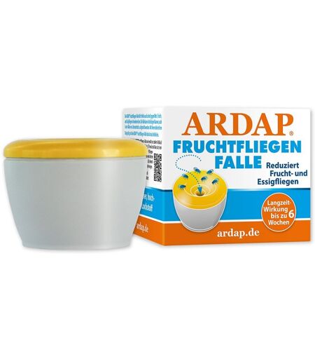 Anwendungsgebiet von Ardap FruchtfliegenfalleDie Ardap Fruchtfliegenfalle hilft effektiv und schnell gegen Obst-, Frucht und Essigfliegen in Innenbereichen.Die Falle kann in beliebigen Räumen, auch in der Nähe von Lebensmitteln, aufgestellt werden.Wirkstoffe / Inhaltsstoffe / ZutatenArdap Fruchtfliegenfalle enthält: Wirkstoffe: Essig 390 g/kg (39,00 % w/w), Apfelsaftkonzentrat 40 g/kg (4,00 % w/w)DosierungAnwendungsempfehlung von Ardap Fruchtfliegenfalle:Platzieren: Stellen Sie die Falle an einem Ort mit starkem Fruchtfliegenbefall auf – z. B. in der Nähe von Obstschalen, Kompostbehältern oder in der Küche.Vorbereiten: Entfernen Sie den Schraubdeckel und die Schutzfolie. Schrauben Sie anschließend die beiliegende Trichterkappe auf die Öffnung.Wirkdauer: Nach dem Öffnen wirkt die Falle bis zu 6 Wochen zuverlässig gegen Fruchtfliegen.Reinigung: Verschüttete Produktreste einfach mit einem Tuch entfernen. Anschließend die Stelle mit Wasser und Spülmittel reinigen.Tipp für optimale Wirkung: Schwenken Sie die Falle ein- bis zweimal pro Woche vorsichtig, um das Aroma des Lockstoffs frisch zu halten.HinweiseACHTUNG: Kann gegenüber Metallen korrosiv sein. Lesen Sie sämtliche Anweisungen aufmerksam und befolgen Sie diese. Ist ärztlicher Rat erforderlich, Verpackung oder Kennzeichnungsetikett bereithalten. Darf nicht in die Hände von Kindern gelangen. Nur in Originalverpackung aufbewahren. Verschüttete Mengen aufnehmen, um Materialschäden zu vermeiden. Besondere Hinweise: Darf nicht in die Hände von Kindern gelangen. Nur zur Verwendung laut Gebrauchsanweisung. Wir sind nicht für die Folgen unsachgemäßer Handhabung verantwortlich. Ausflockung des flüssigen Lockmittels ist möglich. Nicht zum Verzehr geeignet. Erste-Hilfe-Maßnahmen: NACH EINATMEN: An die frische Luft bringen. Bei anhaltenden Symptomen einen Arzt anrufen. NACH HAUTKONTAKT: Haut mit viel Wasser und Seife spülen. Bei anhaltenden Symptomen einen Arzt anrufen. NACH AUGENKONTAKT: Mit W ...