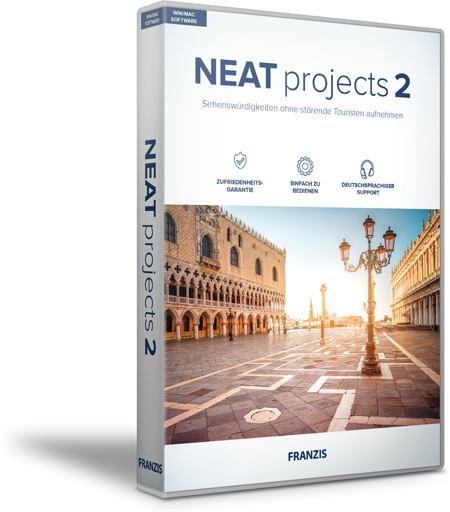 Endlich tolle Bilder von Sehenswürdigkeiten aufnehmen Jeder kennt das: Sie stehen auf dem Markusplatz und wollen ein schönes Erinnerungsfoto schießen, aber vor lauter Menschen sieht man kaum etwas von dem Platz und den Sehenswürdigkeiten. Jetzt gibt es die perfekte Lösung! NEAT projects 2 entfernt alle bewegten Personen, Tiere oder Autos aus dem Bild und macht Ihr Foto zu einem tollen Hingucker, den nicht jeder hat. Wie geht das? Nehmen Sie einfach fünf oder mehr Fotos von derselben Szene auf. NEAT projects 2 rechnet dann alle Personen, die durch das Bild laufen, aus den Fotos heraus und fügt die aufgenommenen Bilder nahtlos zu einem perfekten Bild ohne störende Touristen oder andere bewegte Objekte zusammen – das Ganze funktioniert vollautomatisch und es wird keine Bildbearbeitung benötigt! + Endlich Städtefotos ohne störende Touristen + Vollautomatische Entfernung von bewegten Objek... ...