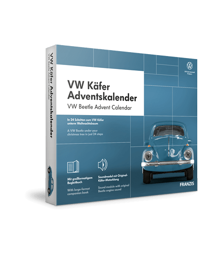 In 24 Tagen zum ultimativen Modellauto Er läuft und läuft und läuft … Das deutsche Wirtschaftswunder der 50er- und 60er-Jahre wurde erst so richtig durch den VW Käfer möglich gemacht. Das Wolfsburger Krabbeltier hat Millionen von Menschen mobil gemacht – und ganz nebenbei mitgeholfen, die Welt zu erkunden. Seine Unkompliziertheit und einzigartige Form machen ihn heute zum beliebtesten Oldtimer auf dem deutschen Markt. Mit diesem Modellbausatz eines VW Käfer in einem zeitgenössischem Blauton aus dem Modelljahr 1970 können Sie die Faszination nacherleben – und sich Ihre eigene Käfer-Erlebniswelt in der Adventszeit aufbauen. Alles drin, alles dran – da schlägt das Herz des Käfer-Fans höher! Stilvolle Verpackung, ein umfangreiches Begleitbuch mit viel Hintergrundwissen und packenden Fotos sowie eine Soundbasis, die auf Knopfdruck original Motorsound präsentiert: ein Fest für... ...