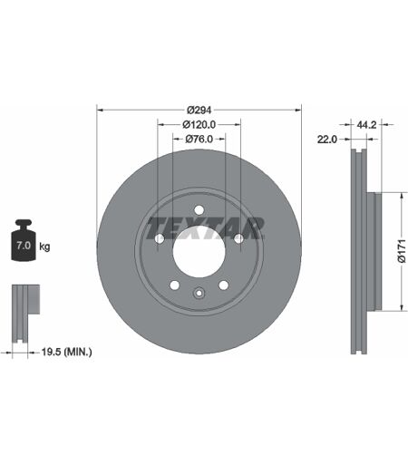 TEXTAR Bremsscheibe PRO Bremsscheibenart:außenbelüftet Außendurchmesser [mm]:294 mm Ergänzungsartikel/Ergänzende Info 2:ohne Radbefestigungsbolzen Ergänzungsartikel/Ergänzende Info 2:ohne Radnabe Bremsscheibendicke [mm]:22 mm Zentrierungsdurchmesser [mm]:76 mm Bohrbild/Lochzahl:05/06 Lochkreis-Ø [mm]:120 mm Verpackungsbreite [cm]:30,8 cm Innendurchmesser [mm]:154,9 mm Verpackungslänge [cm]:30,8 cm Mindestdicke [mm]:19,5 mm Radbolzenbohrung-Ø [mm]:16,6 mm Gewicht [kg]:7 kg Oberfläche:beschichtet Höhe [mm]:44,2 mm Ergänzungsartikel/Ergänzende Info 2:ohne Radlager Verpackungshöhe [cm]:12,7 cmPreis pro Stück! Bremsscheiben müssen immer paarweise gewechselt werden! , u.a. für VW Transporter T5 (7EB, 7EC, 7EF, 7EG, 7EJ, 7HB, 7HF, 7HJ), 1968 cm³, 136 PS (100 kW), 5/2010 bis 8/2015, KBA-Nr: 0603ATKVW Transporter T5 (7EB, 7EC, 7EF, 7EG, 7EJ, 7HB, 7HF, 7HJ), 1968 cm³, 136 PS (100 kW), 5/2010 bis 8/2015, KBA-Nr: 0603ATLVW Multivan T5 (7EF, 7EM, 7EN, 7HF, 7HM, 7HN), 1968 cm³, 136 PS (100 kW), 5/2010 bis 8/2015, KBA-Nr: 0603ATKVW Multivan T5 (7EF, 7EM, 7EN, 7HF, 7HM, 7HN), 1968 cm³, 136 PS (100 kW), 5/2010 bis 8/2015, KBA-Nr: 0603ATLVW Transporter T5 (7EB, 7EC, 7EF, 7EG, 7EJ, 7HB, 7HF, 7HJ), 1968 cm³, 114 PS (84 kW), 5/2011 bis 8/2015, KBA-Nr: 0603BFNVW Multivan T5 (7EF, 7EM, 7EN, 7HF, 7HM, 7HN), 1984 cm³, 115 PS (85 kW), 11/2003 bis 8/2015, KBA-Nr: 0603696VW Multivan T5 (7EF, 7EM, 7EN, 7HF, 7HM, 7HN), 2461 cm³, 130 PS (96 kW), 4/2003 bis 11/2009, KBA-Nr: 0603691VW Multivan T5 (7EF, 7EM, 7EN, 7HF, 7HM, 7HN), 2461 cm³, 174 PS (128 kW), 4/2003 bis 11/2009, KBA-Nr: 0603692VW Multivan T5 (7EF, 7EM, 7EN, 7HF, 7HM, 7HN), 1896 cm³, 105 PS (77 kW), 4/2003 bis 11/2009, KBA-Nr: 0603690VW Transporter T5 (7FD, 7FE, 7FL, 7FY, 7FZ, 7JD, 7JE, 7JL, 7JY, 7JZ), 1896 cm³, 85 PS (63 kW), 4/2003 bis 11/2009, KBA-Nr: 0603712VW Transporter T5 (7FD, 7FE, 7FL, 7FY, 7FZ, 7JD, 7JE, 7JL, 7JY, 7JZ), 1896 cm³, 105 PS (77 kW), 4/2003 bis 11/2009, KBA-Nr: 0603711VW Transporter T5 (7FD, 7FE, 7FL, 7FY, 7FZ, 7JD, 7JE, 7JL, 7JY, 7JZ), 2461 cm³, 130 PS (96 kW), 4/2003 bis 11/2009, KBA-Nr: 0603713VW Transporter T5 (7FD, 7FE, 7FL, 7FY, 7FZ, 7JD, 7JE, 7JL, 7JY, 7JZ), 2461 cm³, 174 PS (128 kW), 4/2003 bis 11/2009, KBA-Nr: 0603714VW Transporter T5 (7FD, 7FE, 7FL, 7FY, 7FZ, 7JD, 7JE, 7JL, 7JY, 7JZ), 1984 cm³, 115 PS (85 kW), 11/2003 bis 5/2013, KBA-Nr: 0603730VW Transporter T5 (7EA, 7EH, 7HA, 7HH), 1896 cm³, 85 PS (63 kW), 4/2003 bis 11/2009, KBA-Nr: 0603076VW Transporter T5 (7EA, 7EH, 7HA, 7HH), 1896 cm³, 105 PS (77 kW), 4/2003 bis 11/2009, KBA-Nr: 0603077VW Transporter T5 (7EA, 7EH, 7HA, 7HH), 2461 cm³, 130 PS (96 kW), 4/2003 bis 11/2009, KBA-Nr: 0603078VW Transporter T5 (7EA, 7EH, 7HA, 7HH), 2461 cm³, 174 PS (128 kW), 4/2003 bis 11/2009, KBA-Nr: 0603079VW Transporter T5 (7EA, 7EH, 7HA, 7HH), 1984 cm³, 115 PS (85 kW), 11/2003 bis 8/2015, KBA-Nr: 0603080VW Transporter T5 (7EB, 7EC, 7EF, 7EG, 7EJ, 7HB, 7HF, 7HJ), 1896 cm³, 85 PS (63 kW), 4/2003 bis 11/2009, KBA-Nr: 0603698VW Transporter T5 (7EB, 7EC,... ...