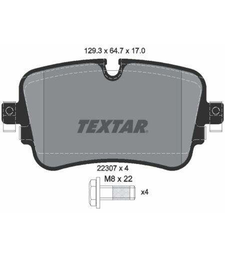 Anzahl Verschleißanzeiger [pro Achse]: 8. Anzahl der Beläge: 4. Anzahl der Schrauben: 4. Breite [mm]: 129,3. Bremssystem: TRW. Dicke [mm]: 17. Hersteller: TEXTAR. Herstellernummer: 2230701. Höhe [mm]: 64,7. Index: 2230701. Material: Low-Metallic. Montage Achse: Hinten. Produktart: Bremsbelagsatz. Typprüfung: ECE R90 APPROVED. Vorbereitung für Verschleißkontakt: Ja. WVA-Nummer: 22307. ...