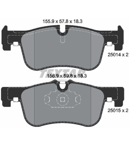 Breite [mm]: 155,9, 156,9. Bremssystem: Teves. Dicke [mm]: 18,3. Hersteller: TEXTAR. Herstellernummer: 2501401. Höhe [mm]: 57,8, 59,8. Index: 2501401. Montage Achse: Vorne. Produktart: Bremsbelagsatz. Vorbereitung für Verschleißkontakt: Ja. WVA-Nummer: 25014. ...