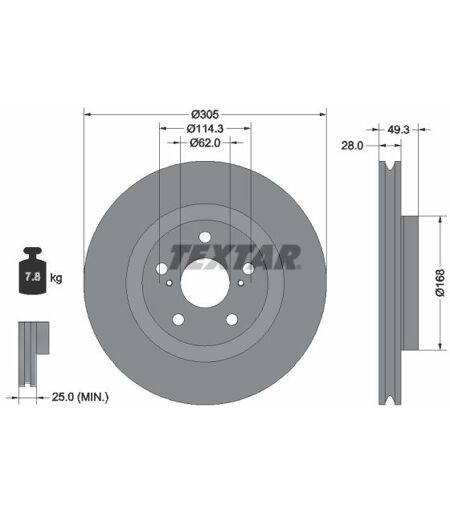 TEXTAR Bremsscheibe Ergänzungsartikel/Ergänzende Info 2:ohne Radbefestigungsbolzen Ergänzungsartikel/Ergänzende Info 2:ohne Radnabe Gewicht [kg]:7,8 kg Bearbeitung:hochgekohlt Lochkreis-Ø [mm]:114,3 mm Bremsscheibendicke [mm]:28 mm Bremsscheibenart:Innenbelüftet Bohrbild/Lochzahl:05/07 Zentrierungsdurchmesser [mm]:62 mm Höhe [mm]:49,3 mm Oberfläche:beschichtet Radbolzenbohrung-Ø [mm]:14,7 mm Verpackungsbreite [cm]:32,8 cm Verpackungshöhe [cm]:12,5 cm Mindestdicke [mm]:25 mm Innendurchmesser [mm]:158 mm Ergänzungsartikel/Ergänzende Info 2:ohne Radlager Verpackungslänge [cm]:32,8 cm Außendurchmesser [mm]:305 mm , u.a. für Toyota C-Hr (X1), 1197 cm³, 116 PS (85 kW), ab 10/2016, KBA-Nr: 5013AKZToyota C-Hr (X1), 1197 cm³, 116 PS (85 kW), ab 10/2016, KBA-Nr: 5013ALAToyota C-Hr (X1), 1798 cm³, 122 PS (90 kW), ab 10/2016Toyota C-Hr (X1), 1987 cm³, 148 PS (109 kW), ab 11/2016Toyota Camry (V7, VA7, VH7), 2487 cm³, 178 PS (131 kW), ab 8/2017, KBA-Nr: 5013ANGToyota Camry (V7, VA7, VH7), 2494 cm³, 181 PS (133 kW), ab 8/2017Toyota Camry (V7, VA7, VH7), 1998 cm³, 150 PS (110 kW), ab 10/2017Toyota C-Hr (X1), 1197 cm³, 131 PS (96 kW), ab 10/2016Lexus UX (AA1, AH1, MA1), 1987 cm³, 171 PS (126 kW), ab 10/2018, KBA-Nr: 5013AMZLexus UX (AA1, AH1, MA1), 1987 cm³, 145 PS (107 kW), ab 10/2018Lexus UX (AA1, AH1, MA1), 1987 cm³, 152 PS (112 kW), ab 10/2018, KBA-Nr: 5013ANBLexus UX (AA1, AH1, MA1), 1987 cm³, 152 PS (112 kW), ab 10/2018, KBA-Nr: 5013ANALexus UX (AA1, AH1, MA1), 1987 cm³, 150 PS (110 kW), ab 10/2018Lexus ES (A10, H10, Z10), 1998 cm³, 150 PS (110 kW), ab 10/2018Lexus ES (A10, H10, Z10), 2487 cm³, 200 PS (147 kW), ab 10/2018Lexus ES (A10, H10, Z10), 3456 cm³, 249 PS (183 kW), ab 10/2018Toyota Rav 4 V (A5, H5), 2487 cm³, 178 PS (131 kW), ab 12/2018, KBA-Nr: 5013AMPToyota Rav 4 V (A5, H5), 1987 cm³, 175 PS (129 kW), ab 12/2018, KBA-Nr: 5013AMQToyota Rav 4 V (A5, H5), 1987 cm³, 175 PS (129 kW), ab 12/2018, KBA-Nr: 5013AMRToyota Rav 4 V (A5, H5), 1987 cm³, 173 PS (127 kW), ab 12/2018Toyota Rav 4 V (A5, H5), 1987 cm³, 173 PS (127 kW), ab 2/2019Toyota Rav 4 V (A5, H5), 1987 cm³, 150 PS (110 kW), ab 12/2018Toyota Rav 4 V (A5, H5), 2487 cm³, 203 PS (149 kW), ab 12/2018Toyota Rav 4 V (A5, H5), 2487 cm³, 222 PS (163 kW), ab 12/2018Lexus UX (AA1, AH1, MA1), 204 PS (150 kW), ab 4/2020, KBA-Nr: 5013APEToyota Rav 4 V (A5, H5), 1987 cm³, 175 PS (129 kW), ab 12/2018Toyota Rav 4 V (A5, H5), 2487 cm³, 178 PS (131 kW), ab 12/2018Toyota C-Hr (X1), 1798 cm³, 98 PS (72 kW), ab 10/2016 , OE-Nummer:FERODO:DDF2883C1DDBA Australia:DBA2744XDBA Australia:DBA2744SEUROREPAR:1684315880DELPHI:BG5117CTRW:DF6916STRISCAN:8120131074CVALEO:673290ZIMMERMANN:590284020TEXTAR:2276801304300TRW:DF8407SPAGID:T2731N56043N00APEC:DSK3524APEC:DSK3840ADVICS:A6F828BBORG & BECK:BBD5595MINTEX:MDC3062CMXDBA Australia:DBA42744XSJAPKO:602055CPAGID:56043HCTRW:DF8407XSSFERODO:DUM563925DBA Australia:DBA42744BOSCH:0986T15432ZIMMERMANN:590284053HELLA PAGID:355135241DBA... ...