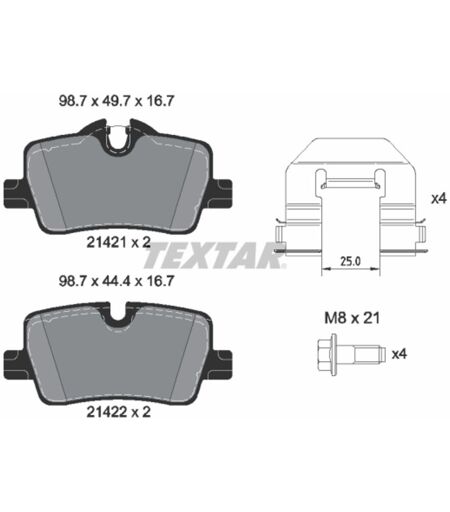 Breite [mm]: 98,7. Bremssystem: TRW. Dicke [mm]: 16,7. Hersteller: TEXTAR. Herstellernummer: 2142101. Höhe [mm]: 49,7, 44,4. Index: 2142101. Montage Achse: Hinten. Produktart: Bremsbelagsatz. Vorbereitung für Verschleißkontakt: Ja. WVA-Nummer: 21421. ...