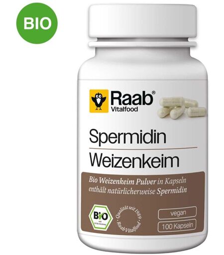brAnwendungsgebiet von Raab Vitalfood Spermidin Bio KapselnBio Spermidin Kapseln von Raab Vitalfood Raab Bio Spermidin Kapseln enthalten ausschließlich hochwertiges Bio Weizenkeim Pulver, welches von Natur aus Spermidin enthält. Für das Pulver wird einzig der wertvolle Keim des Weizenkorns verwendet, der nur einen winzigen Teil des reifen Korns ausmacht. Der Keim wird sorgfältig vom Mehlkörper abgetrennt, anschließend entölt und fein vermahlen. Dadurch wird das enthaltene Spermidin aufkonzentriert. Raab Vitalfood – Nahrungsergänzung in Premium Bio-Qualität seit 1989 Im bayerischen Rohrbach an der Ilm entwickelt, produziert und vertreibt Raab Vitalfood pflanzliche Lebensmittel, Proteine und Nahrungsergänzung in bester Bio-Qualität – und das seit 1989. Raab Vitalfood Spermidin Bio Kapseln sind ein Nahrungsergänzungsmittel aus Bio-Weizenkeim-Pulver mit standardisiertem Gehalt von 1 mg Spermidin pro Tagesportion.Wirkstoffe / Inhaltsstoffe / ZutatenRaab Vitalfood Spermidin Bio Kapseln enthält: Zutaten: Weizenkeim Pulver, entölt*2), pflanzliche Kapselhülle: Hydroxypropylmethylcellulose *aus kontrolliert biologischem Anbau 2)Weizen aus der EU Kann Spuren von Schalenfrüchten (Mandeln, Haselnüsse, Walnüsse, Cashewnüsse, Pecanüsse), Sellerie, Senf, Soja und Lupinen enthalten. Inhaltsstoffe Pro 100 g Pro 4 Kapseln* Spermidin 42 mg 1 mg *empfohlene TagesverzehrmengeGegenanzeigenBei bekannter Überempfindlichkeit gegenüber einem der oben genannten Inhaltsstoffe sollte dieses Produkt nicht angewendet werden. DosierungVerzehrempfehlung von Raab Vitalfood Spermidin Bio Kapseln: Täglich zu einer Mahlzeit 4 Kapseln mit reichlich Wasser einnehmen.HinweiseDie empfohlene tägliche Verzehrsmenge darf nicht überschritten werden. Außerhalb der Reichweite von kleinen Kindern aufbewahren. Nahrungsergänzungsmittel sollten nicht als Ersatz für eine ausgewogene, abwechslungsreiche E ...