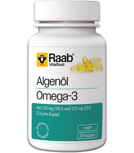 Nahrungsergänzungsmittel sind kein Ersatz für eine ausgewogene und abwechslungsreiche Ernährung und eine gesunde Lebensweise.Raab Vitalfood® Omega-3 aus Algenöl KapselnRaab Algenöl Omega-3 Kapseln enthalten Algenöl aus der einzelligen Mikroalge Schizochytrium sp. Das Algenöl wird durch Fermentation der Mikroalge unter kontrollierten Bedingungen im geschlossenen System gewonnen. Algenöl ist rein pflanzlich. DHA und EPA tragen zu einer normalen Herzfunktion bei. DHA trägt zur Erhaltung normaler Sehkraft und zur Erhaltung einer normalen Gehirnfunktion bei.aus Mikroalgen unter kontrollierten Bedingungen im geschlossenen System gewonnen (Fermentation) pflanzliche Alternative zu Fischöl, nur 1 Kapsel täglichDHA und EPA tragen zu einer normalen Herzfunktion bei. DHA trägt zur Erhaltung normaler Sehkraft und zur Erhaltung einer normalen Gehirnfunktion beiZutaten:68 % DHA- und EPA-reiches Öl aus der Mikroalge Schizochytrium sp. (aus den USA), Kapselhülle (Feuchthaltemittel: Glycerin, modifizierte Maisstärke, Verdickungsmittel: Carrageen, Wasser, Säureregulator: Natriumcarbonat), Sonnenblumenöl, Extrakt aus Rosmarin, Antioxidationsmittel: stark tocopherolhaltige Extrakte und AscorbylpalmitatNährwertangaben:InhaltsstoffePro 100 gPro 1 Kaps.*Algenöl aus Schizochytrium sp.67878 mg803 mgOmega-3-Fettsäuren37349 mg442 mg ‑ davon Docosahexaensäure (DHA)21125 mg250 mg ‑ davon Eicosapentaensäure (EPA)10563 mg125 mg*empfohlene TagesverzehrmengeVerzehrsempfehlung:Täglich zu einer Mahlzeit 1 Kapsel mit reichlich Wasser einnehmen.Aufbewahrungs- & Verwendungshinweis:Die angegebene empfohlene Tagesverzehrmenge darf nicht überschritten werden. Nahrungsergänzungsmittel sind kein Ersatz für eine abwechslungsreiche und ausgewogene Ernährung. Außerhalb der Reichweite von kleinen Kindern aufbewahren. Eine abwechslungsreiche, ausgewogene Ernährung und eine gesunde Lebensweise sind von großer Bedeutung. Die genannten positiven Wirkungen von DHA und EPA treten bei einer täglichen Aufnahme von 250 mg DHA und EPA ein. Die genannte positive Wirkung von DHA tritt bei einer täglichen Aufnahme von 250 mg DHA ein. Vor Licht und Wärme geschützt, trocken und gut verschlossen lagern.Nettofüllmenge:30 StückHestellerdaten:Raab Vitalfood GmbH, Rudolf-Diesel-Str. 10, D-85296 Rohrbach ...