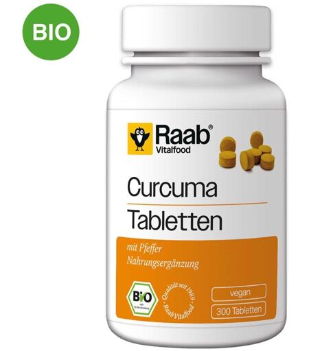 Anwendungsgebiet von Raab Vitalfood Curcuma Bio TablettenBio Curcuma Tabletten von Raab Vitalfood Die Gelbwurz, auch Curcuma genannt, ist eine tropische Gebirgspflanze und gehört zur Familie der Ingwergewächse. Ihre Heimat ist Indien und Südostasien. Curcuma enthält natürlicherweise den sekundären Pflanzenstoff Curcumin, welcher der Pflanze die gelborange Färbung verleiht. Raab Bio Curcuma Tabletten enthalten Curcumin aus Curcuma und Piperin aus Pfeffer. Raab Vitalfood – Nahrungsergänzung in Premium Bio-Qualität seit 1989 Im bayerischen Rohrbach an der Ilm entwickelt, produziert und vertreibt Raab Vitalfood pflanzliche Lebensmittel, Proteine und Nahrungsergänzung in bester Bio-Qualität – und das seit 1989. Raab Vitalfood Curcuma Bio Tabletten sind ein Nahrungsergänzungsmittel mit Curcumin aus Curcuma und Piperin aus Pfeffer. Vegan. Glutenfrei. Laktosefrei.Wirkstoffe / Inhaltsstoffe / ZutatenRaab Vitalfood Curcuma Bio Tabletten enthält: 75 % Curcumapulver*2, Maissiruppul- ver*, Trennmittel: Magnesiumcarbonat, 1,6 % Pfeffer* (*aus kontrolliert biologischem Anbau 2 Curcuma- wurzeln aus Madagascar) Inhaltsstoffe Pro 100 g Pro 6 Tabletten* Curcumin 3890 mg 70 mg Piperin 112 mg 2 mg *empfohlene TagesverzehrmengeGegenanzeigenBei bekannter Überempfindlichkeit gegenüber einem der oben genannten Inhaltsstoffe sollte dieses Produkt nicht angewendet werden. DosierungVerzehrempfehlung von Raab Vitalfood Curcuma Bio Tabletten: Zweimal täglich je 3 Tabletten mit reichlich Wasser einnehmen.HinweiseDie empfohlene tägliche Verzehrsmenge darf nicht überschritten werden. Außerhalb der Reichweite von kleinen Kindern aufbewahren. Nahrungsergänzungsmittel sollten nicht als Ersatz für eine ausgewogene, abwechslungsreiche Ernährung und gesunde Lebensweise verwendet werden.Die Einnahme wird nicht empfohlen für Schwangere, Stillende und Kin ...